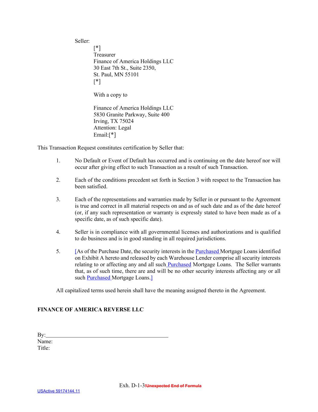 Exh. D-1-3!Unexpected End of Formula USActive 59174144.11 Seller: [*] Treasurer Finance of America Holdings LLC 30 East 7th St., Suite 2350, St. Paul, MN 55101 [*] With a copy to Finance of America Holdings LLC 5830 Granite Parkway, Suite 400 Irving, TX 75024 Attention: Legal Email:[*] This Transaction Request constitutes certification by Seller that: 1. No Default or Event of Default has occurred and is continuing on the date hereof nor will occur after giving effect to such Transaction as a result of such Transaction. 2. Each of the conditions precedent set forth in Section 3 with respect to the Transaction has been satisfied. 3. Each of the representations and warranties made by Seller in or pursuant to the Agreement is true and correct in all material respects on and as of such date and as of the date hereof (or, if any such representation or warranty is expressly stated to have been made as of a specific date, as of such specific date). 4. Seller is in compliance with all governmental licenses and authorizations and is qualified to do business and is in good standing in all required jurisdictions. 5. [As of the Purchase Date, the security interests in the Purchased Mortgage Loans identified on Exhibit A hereto and released by each Warehouse Lender comprise all security interests relating to or affecting any and all such Purchased Mortgage Loans. The Seller warrants that, as of such time, there are and will be no other security interests affecting any or all such Purchased Mortgage Loans.] All capitalized terms used herein shall have the meaning assigned thereto in the Agreement. FINANCE OF AMERICA REVERSE LLC By: Name: Title: