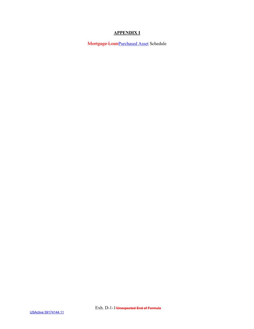 Exh. D-1-1!Unexpected End of Formula USActive 59174144.11 APPENDIX I Mortgage LoanPurchased Asset Schedule