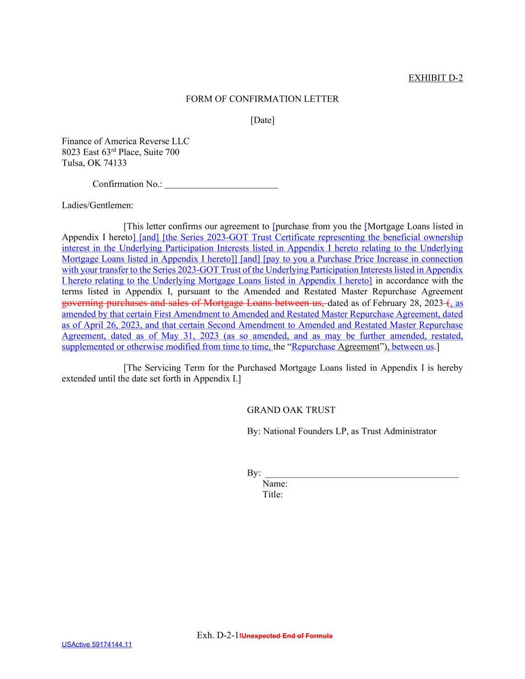 Exh. D-2-1!Unexpected End of Formula USActive 59174144.11 EXHIBIT D-2 FORM OF CONFIRMATION LETTER [Date] Finance of America Reverse LLC 8023 East 63rd Place, Suite 700 Tulsa, OK 74133 Confirmation No.: Ladies/Gentlemen: [This letter confirms our agreement to [purchase from you the [Mortgage Loans listed in Appendix I hereto] [and] [the Series 2023-GOT Trust Certificate representing the beneficial ownership interest in the Underlying Participation Interests listed in Appendix I hereto relating to the Underlying Mortgage Loans listed in Appendix I hereto]] [and] [pay to you a Purchase Price Increase in connection with your transfer to the Series 2023-GOT Trust of the Underlying Participation Interests listed in Appendix I hereto relating to the Underlying Mortgage Loans listed in Appendix I hereto] in accordance with the terms listed in Appendix I, pursuant to the Amended and Restated Master Repurchase Agreement governing purchases and sales of Mortgage Loans between us, dated as of February 28, 2023 (, as amended by that certain First Amendment to Amended and Restated Master Repurchase Agreement, dated as of April 26, 2023, and that certain Second Amendment to Amended and Restated Master Repurchase Agreement, dated as of May 31, 2023 (as so amended, and as may be further amended, restated, supplemented or otherwise modified from time to time, the “Repurchase Agreement”), between us.] [The Servicing Term for the Purchased Mortgage Loans listed in Appendix I is hereby extended until the date set forth in Appendix I.] GRAND OAK TRUST By: National Founders LP, as Trust Administrator By: _________________________________________ Name: Title: