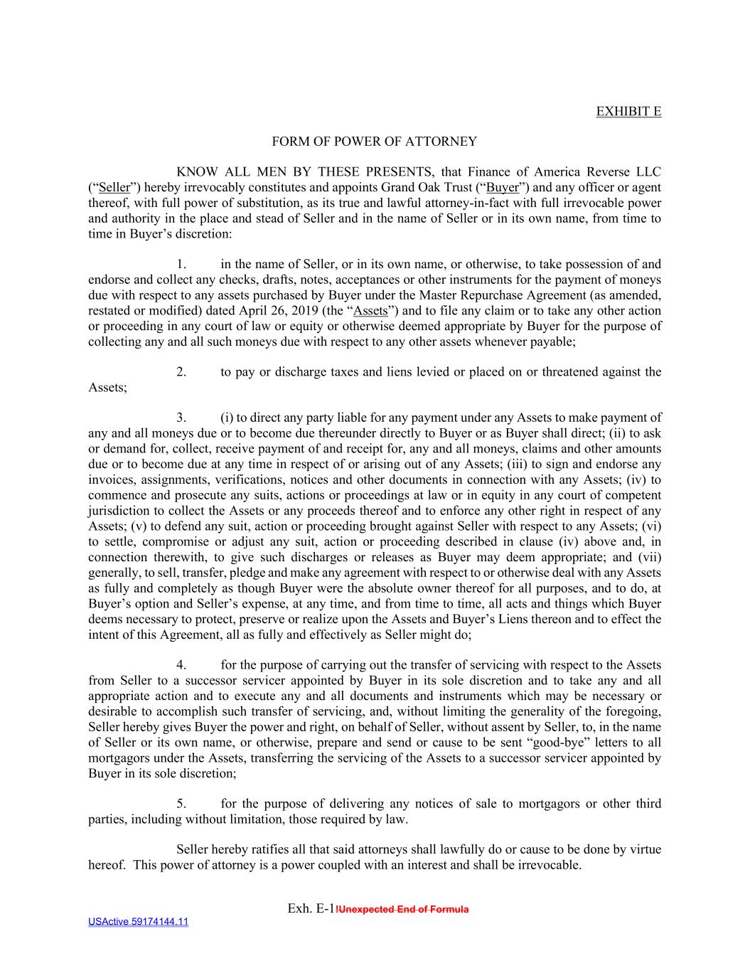 Exh. E-1!Unexpected End of Formula USActive 59174144.11 EXHIBIT E FORM OF POWER OF ATTORNEY KNOW ALL MEN BY THESE PRESENTS, that Finance of America Reverse LLC (“Seller”) hereby irrevocably constitutes and appoints Grand Oak Trust (“Buyer”) and any officer or agent thereof, with full power of substitution, as its true and lawful attorney-in-fact with full irrevocable power and authority in the place and stead of Seller and in the name of Seller or in its own name, from time to time in Buyer’s discretion: 1. in the name of Seller, or in its own name, or otherwise, to take possession of and endorse and collect any checks, drafts, notes, acceptances or other instruments for the payment of moneys due with respect to any assets purchased by Buyer under the Master Repurchase Agreement (as amended, restated or modified) dated April 26, 2019 (the “Assets”) and to file any claim or to take any other action or proceeding in any court of law or equity or otherwise deemed appropriate by Buyer for the purpose of collecting any and all such moneys due with respect to any other assets whenever payable; 2. to pay or discharge taxes and liens levied or placed on or threatened against the Assets; 3. (i) to direct any party liable for any payment under any Assets to make payment of any and all moneys due or to become due thereunder directly to Buyer or as Buyer shall direct; (ii) to ask or demand for, collect, receive payment of and receipt for, any and all moneys, claims and other amounts due or to become due at any time in respect of or arising out of any Assets; (iii) to sign and endorse any invoices, assignments, verifications, notices and other documents in connection with any Assets; (iv) to commence and prosecute any suits, actions or proceedings at law or in equity in any court of competent jurisdiction to collect the Assets or any proceeds thereof and to enforce any other right in respect of any Assets; (v) to defend any suit, action or proceeding brought against Seller with respect to any Assets; (vi) to settle, compromise or adjust any suit, action or proceeding described in clause (iv) above and, in connection therewith, to give such discharges or releases as Buyer may deem appropriate; and (vii) generally, to sell, transfer, pledge and make any agreement with respect to or otherwise deal with any Assets as fully and completely as though Buyer were the absolute owner thereof for all purposes, and to do, at Buyer’s option and Seller’s expense, at any time, and from time to time, all acts and things which Buyer deems necessary to protect, preserve or realize upon the Assets and Buyer’s Liens thereon and to effect the intent of this Agreement, all as fully and effectively as Seller might do; 4. for the purpose of carrying out the transfer of servicing with respect to the Assets from Seller to a successor servicer appointed by Buyer in its sole discretion and to take any and all appropriate action and to execute any and all documents and instruments which may be necessary or desirable to accomplish such transfer of servicing, and, without limiting the generality of the foregoing, Seller hereby gives Buyer the power and right, on behalf of Seller, without assent by Seller, to, in the name of Seller or its own name, or otherwise, prepare and send or cause to be sent “good-bye” letters to all mortgagors under the Assets, transferring the servicing of the Assets to a successor servicer appointed by Buyer in its sole discretion; 5. for the purpose of delivering any notices of sale to mortgagors or other third parties, including without limitation, those required by law. Seller hereby ratifies all that said attorneys shall lawfully do or cause to be done by virtue hereof. This power of attorney is a power coupled with an interest and shall be irrevocable.