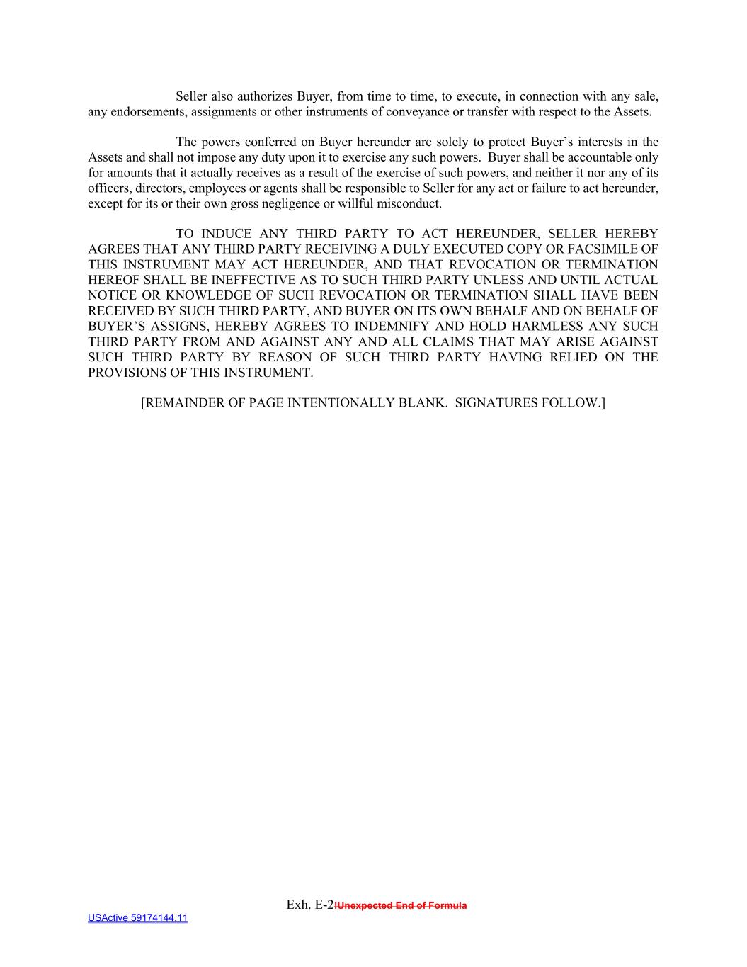Exh. E-2!Unexpected End of Formula USActive 59174144.11 Seller also authorizes Buyer, from time to time, to execute, in connection with any sale, any endorsements, assignments or other instruments of conveyance or transfer with respect to the Assets. The powers conferred on Buyer hereunder are solely to protect Buyer’s interests in the Assets and shall not impose any duty upon it to exercise any such powers. Buyer shall be accountable only for amounts that it actually receives as a result of the exercise of such powers, and neither it nor any of its officers, directors, employees or agents shall be responsible to Seller for any act or failure to act hereunder, except for its or their own gross negligence or willful misconduct. TO INDUCE ANY THIRD PARTY TO ACT HEREUNDER, SELLER HEREBY AGREES THAT ANY THIRD PARTY RECEIVING A DULY EXECUTED COPY OR FACSIMILE OF THIS INSTRUMENT MAY ACT HEREUNDER, AND THAT REVOCATION OR TERMINATION HEREOF SHALL BE INEFFECTIVE AS TO SUCH THIRD PARTY UNLESS AND UNTIL ACTUAL NOTICE OR KNOWLEDGE OF SUCH REVOCATION OR TERMINATION SHALL HAVE BEEN RECEIVED BY SUCH THIRD PARTY, AND BUYER ON ITS OWN BEHALF AND ON BEHALF OF BUYER’S ASSIGNS, HEREBY AGREES TO INDEMNIFY AND HOLD HARMLESS ANY SUCH THIRD PARTY FROM AND AGAINST ANY AND ALL CLAIMS THAT MAY ARISE AGAINST SUCH THIRD PARTY BY REASON OF SUCH THIRD PARTY HAVING RELIED ON THE PROVISIONS OF THIS INSTRUMENT. [REMAINDER OF PAGE INTENTIONALLY BLANK. SIGNATURES FOLLOW.]