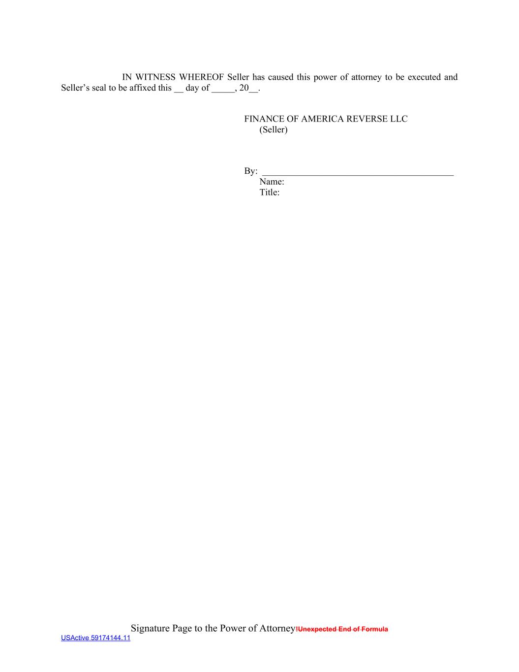 Signature Page to the Power of Attorney!Unexpected End of Formula USActive 59174144.11 IN WITNESS WHEREOF Seller has caused this power of attorney to be executed and Seller’s seal to be affixed this __ day of _____, 20__. FINANCE OF AMERICA REVERSE LLC (Seller) By: _________________________________________ Name: Title: