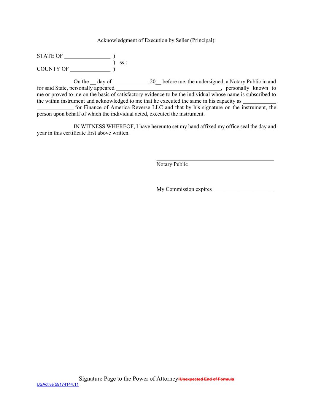 Signature Page to the Power of Attorney!Unexpected End of Formula USActive 59174144.11 Acknowledgment of Execution by Seller (Principal): STATE OF ) ) ss.: COUNTY OF ) On the __ day of , 20__ before me, the undersigned, a Notary Public in and for said State, personally appeared , personally known to me or proved to me on the basis of satisfactory evidence to be the individual whose name is subscribed to the within instrument and acknowledged to me that he executed the same in his capacity as for Finance of America Reverse LLC and that by his signature on the instrument, the person upon behalf of which the individual acted, executed the instrument. IN WITNESS WHEREOF, I have hereunto set my hand affixed my office seal the day and year in this certificate first above written. Notary Public My Commission expires _____________________