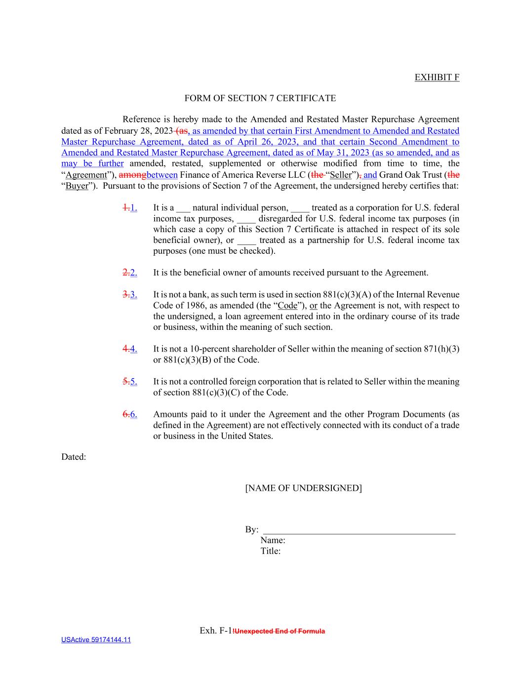 Exh. F-1!Unexpected End of Formula USActive 59174144.11 EXHIBIT F FORM OF SECTION 7 CERTIFICATE Reference is hereby made to the Amended and Restated Master Repurchase Agreement dated as of February 28, 2023 (as, as amended by that certain First Amendment to Amended and Restated Master Repurchase Agreement, dated as of April 26, 2023, and that certain Second Amendment to Amended and Restated Master Repurchase Agreement, dated as of May 31, 2023 (as so amended, and as may be further amended, restated, supplemented or otherwise modified from time to time, the “Agreement”), amongbetween Finance of America Reverse LLC (the “Seller”), and Grand Oak Trust (the “Buyer”). Pursuant to the provisions of Section 7 of the Agreement, the undersigned hereby certifies that: 1.1. It is a ___ natural individual person, ____ treated as a corporation for U.S. federal income tax purposes, ____ disregarded for U.S. federal income tax purposes (in which case a copy of this Section 7 Certificate is attached in respect of its sole beneficial owner), or ____ treated as a partnership for U.S. federal income tax purposes (one must be checked). 2.2. It is the beneficial owner of amounts received pursuant to the Agreement. 3.3. It is not a bank, as such term is used in section 881(c)(3)(A) of the Internal Revenue Code of 1986, as amended (the “Code”), or the Agreement is not, with respect to the undersigned, a loan agreement entered into in the ordinary course of its trade or business, within the meaning of such section. 4.4. It is not a 10-percent shareholder of Seller within the meaning of section 871(h)(3) or 881(c)(3)(B) of the Code. 5.5. It is not a controlled foreign corporation that is related to Seller within the meaning of section 881(c)(3)(C) of the Code. 6.6. Amounts paid to it under the Agreement and the other Program Documents (as defined in the Agreement) are not effectively connected with its conduct of a trade or business in the United States. Dated: [NAME OF UNDERSIGNED] By: _________________________________________ Name: Title: