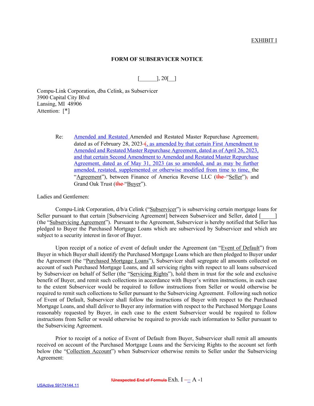 !Unexpected End of Formula Exh. I –– A -1 USActive 59174144.11 EXHIBIT I FORM OF SUBSERVICER NOTICE [______], 20[__] Compu-Link Corporation, dba Celink, as Subservicer 3900 Capital City Blvd Lansing, MI 48906 Attention: [*] Re: Amended and Restated Amended and Restated Master Repurchase Agreement, dated as of February 28, 2023 (, as amended by that certain First Amendment to Amended and Restated Master Repurchase Agreement, dated as of April 26, 2023, and that certain Second Amendment to Amended and Restated Master Repurchase Agreement, dated as of May 31, 2023 (as so amended, and as may be further amended, restated, supplemented or otherwise modified from time to time, the “Agreement”), between Finance of America Reverse LLC (the “Seller”), and Grand Oak Trust (the “Buyer”). Ladies and Gentlemen: Compu-Link Corporation, d/b/a Celink (“Subservicer”) is subservicing certain mortgage loans for Seller pursuant to that certain [Subservicing Agreement] between Subservicer and Seller, dated [_____] (the “Subservicing Agreement”). Pursuant to the Agreement, Subservicer is hereby notified that Seller has pledged to Buyer the Purchased Mortgage Loans which are subserviced by Subservicer and which are subject to a security interest in favor of Buyer. Upon receipt of a notice of event of default under the Agreement (an “Event of Default”) from Buyer in which Buyer shall identify the Purchased Mortgage Loans which are then pledged to Buyer under the Agreement (the “Purchased Mortgage Loans”), Subservicer shall segregate all amounts collected on account of such Purchased Mortgage Loans, and all servicing rights with respect to all loans subserviced by Subservicer on behalf of Seller (the “Servicing Rights”), hold them in trust for the sole and exclusive benefit of Buyer, and remit such collections in accordance with Buyer’s written instructions, in each case to the extent Subservicer would be required to follow instructions from Seller or would otherwise be required to remit such collections to Seller pursuant to the Subservicing Agreement. Following such notice of Event of Default, Subservicer shall follow the instructions of Buyer with respect to the Purchased Mortgage Loans, and shall deliver to Buyer any information with respect to the Purchased Mortgage Loans reasonably requested by Buyer, in each case to the extent Subservicer would be required to follow instructions from Seller or would otherwise be required to provide such information to Seller pursuant to the Subservicing Agreement. Prior to receipt of a notice of Event of Default from Buyer, Subservicer shall remit all amounts received on account of the Purchased Mortgage Loans and the Servicing Rights to the account set forth below (the “Collection Account”) when Subservicer otherwise remits to Seller under the Subservicing Agreement: