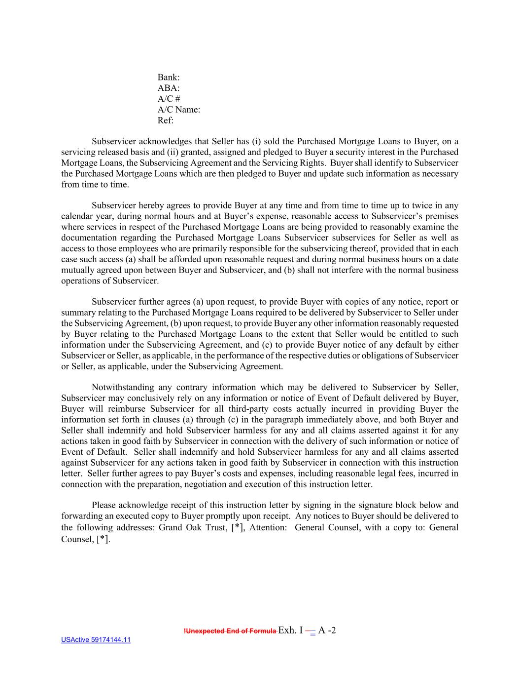 !Unexpected End of Formula Exh. I –– A -2 USActive 59174144.11 Bank: ABA: A/C # A/C Name: Ref: Subservicer acknowledges that Seller has (i) sold the Purchased Mortgage Loans to Buyer, on a servicing released basis and (ii) granted, assigned and pledged to Buyer a security interest in the Purchased Mortgage Loans, the Subservicing Agreement and the Servicing Rights. Buyer shall identify to Subservicer the Purchased Mortgage Loans which are then pledged to Buyer and update such information as necessary from time to time. Subservicer hereby agrees to provide Buyer at any time and from time to time up to twice in any calendar year, during normal hours and at Buyer’s expense, reasonable access to Subservicer’s premises where services in respect of the Purchased Mortgage Loans are being provided to reasonably examine the documentation regarding the Purchased Mortgage Loans Subservicer subservices for Seller as well as access to those employees who are primarily responsible for the subservicing thereof, provided that in each case such access (a) shall be afforded upon reasonable request and during normal business hours on a date mutually agreed upon between Buyer and Subservicer, and (b) shall not interfere with the normal business operations of Subservicer. Subservicer further agrees (a) upon request, to provide Buyer with copies of any notice, report or summary relating to the Purchased Mortgage Loans required to be delivered by Subservicer to Seller under the Subservicing Agreement, (b) upon request, to provide Buyer any other information reasonably requested by Buyer relating to the Purchased Mortgage Loans to the extent that Seller would be entitled to such information under the Subservicing Agreement, and (c) to provide Buyer notice of any default by either Subservicer or Seller, as applicable, in the performance of the respective duties or obligations of Subservicer or Seller, as applicable, under the Subservicing Agreement. Notwithstanding any contrary information which may be delivered to Subservicer by Seller, Subservicer may conclusively rely on any information or notice of Event of Default delivered by Buyer, Buyer will reimburse Subservicer for all third-party costs actually incurred in providing Buyer the information set forth in clauses (a) through (c) in the paragraph immediately above, and both Buyer and Seller shall indemnify and hold Subservicer harmless for any and all claims asserted against it for any actions taken in good faith by Subservicer in connection with the delivery of such information or notice of Event of Default. Seller shall indemnify and hold Subservicer harmless for any and all claims asserted against Subservicer for any actions taken in good faith by Subservicer in connection with this instruction letter. Seller further agrees to pay Buyer’s costs and expenses, including reasonable legal fees, incurred in connection with the preparation, negotiation and execution of this instruction letter. Please acknowledge receipt of this instruction letter by signing in the signature block below and forwarding an executed copy to Buyer promptly upon receipt. Any notices to Buyer should be delivered to the following addresses: Grand Oak Trust, [*], Attention: General Counsel, with a copy to: General Counsel, [*].