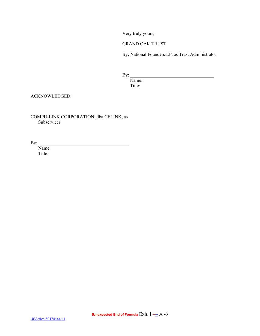 !Unexpected End of Formula Exh. I –– A -3 USActive 59174144.11 Very truly yours, GRAND OAK TRUST By: National Founders LP, as Trust Administrator By: ____________________________________ Name: Title: ACKNOWLEDGED: COMPU-LINK CORPORATION, dba CELINK, as Subservicer By: ______________________________________ Name: Title: