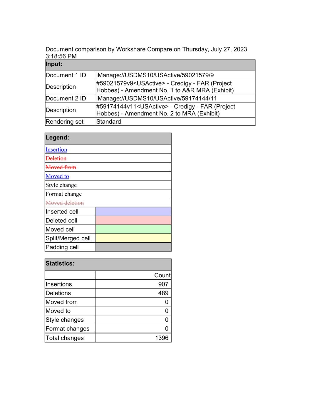 Document comparison by Workshare Compare on Thursday, July 27, 2023 3:18:56 PM Input: Document 1 ID iManage://USDMS10/USActive/59021579/9 Description #59021579v9<USActive> - Credigy - FAR (Project Hobbes) - Amendment No. 1 to A&R MRA (Exhibit) Document 2 ID iManage://USDMS10/USActive/59174144/11 Description #59174144v11<USActive> - Credigy - FAR (Project Hobbes) - Amendment No. 2 to MRA (Exhibit) Rendering set Standard Legend: Insertion Deletion Moved from Moved to Style change Format change Moved deletion Inserted cell Deleted cell Moved cell Split/Merged cell Padding cell Statistics: Count Insertions 907 Deletions 489 Moved from 0 Moved to 0 Style changes 0 Format changes 0 Total changes 1396