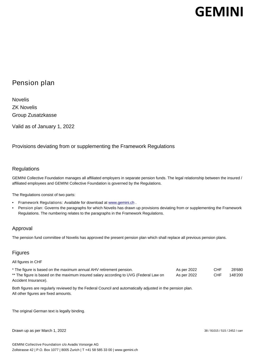Pension plan Novelis ZK Novelis Group Zusatzkasse Valid as of January 1, 2022 Provisions deviating from or supplementing the Framework Regulations Regulations GEMINI Collective Foundation manages all affiliated employers in separate pension funds. The legal relationship between the insured / affiliated employees and GEMINI Collective Foundation is governed by the Regulations. The Regulations consist of two parts: • Framework Regulations: Available for download at www.gemini.ch . • Pension plan: Governs the paragraphs for which Novelis has drawn up provisions deviating from or supplementing the Framework Regulations. The numbering relates to the paragraphs in the Framework Regulations. Approval The pension fund committee of Novelis has approved the present pension plan which shall replace all previous pension plans. Figures All figures in CHF * The figure is based on the maximum annual AHV retirement pension. As per 2022 CHF 28'680 ** The figure is based on the maximum insured salary according to UVG (Federal Law on Accident Insurance). As per 2022 CHF 148'200 Both figures are regularly reviewed by the Federal Council and automatically adjusted in the pension plan. All other figures are fixed amounts. The original German text is legally binding. Drawn up as per March 1, 2022 38 / 91015 / 515 / 2452 / carr GEMINI Collective Foundation c/o Avadis Vorsorge AG Zollstrasse 42 | P.O. Box 1077 | 8005 Zurich | T +41 58 585 33 00 | www.gemini.ch