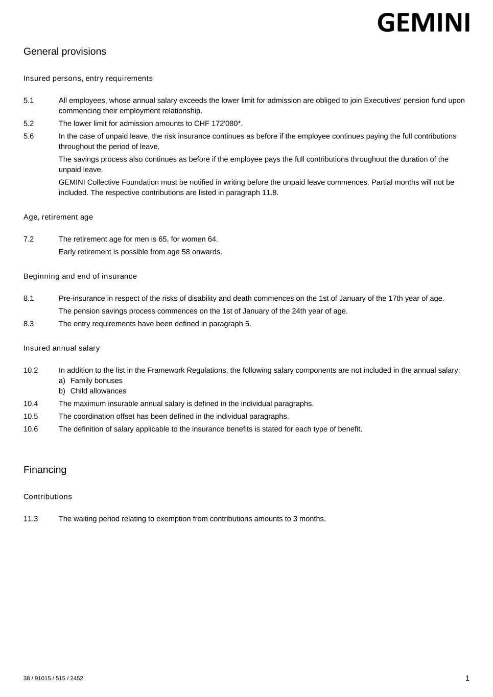 General provisions Insured persons, entry requirements 5.1 All employees, whose annual salary exceeds the lower limit for admission are obliged to join Executives' pension fund upon commencing their employment relationship. 5.2 The lower limit for admission amounts to CHF 172'080*. 5.6 In the case of unpaid leave, the risk insurance continues as before if the employee continues paying the full contributions throughout the period of leave. The savings process also continues as before if the employee pays the full contributions throughout the duration of the unpaid leave. GEMINI Collective Foundation must be notified in writing before the unpaid leave commences. Partial months will not be included. The respective contributions are listed in paragraph 11.8. Age, retirement age 7.2 The retirement age for men is 65, for women 64. Early retirement is possible from age 58 onwards. Beginning and end of insurance 8.1 Pre-insurance in respect of the risks of disability and death commences on the 1st of January of the 17th year of age. The pension savings process commences on the 1st of January of the 24th year of age. 8.3 The entry requirements have been defined in paragraph 5. Insured annual salary 10.2 In addition to the list in the Framework Regulations, the following salary components are not included in the annual salary: a) Family bonuses b) Child allowances 10.4 The maximum insurable annual salary is defined in the individual paragraphs. 10.5 The coordination offset has been defined in the individual paragraphs. 10.6 The definition of salary applicable to the insurance benefits is stated for each type of benefit. Financing Contributions 11.3 The waiting period relating to exemption from contributions amounts to 3 months. 38 / 91015 / 515 / 2452 1