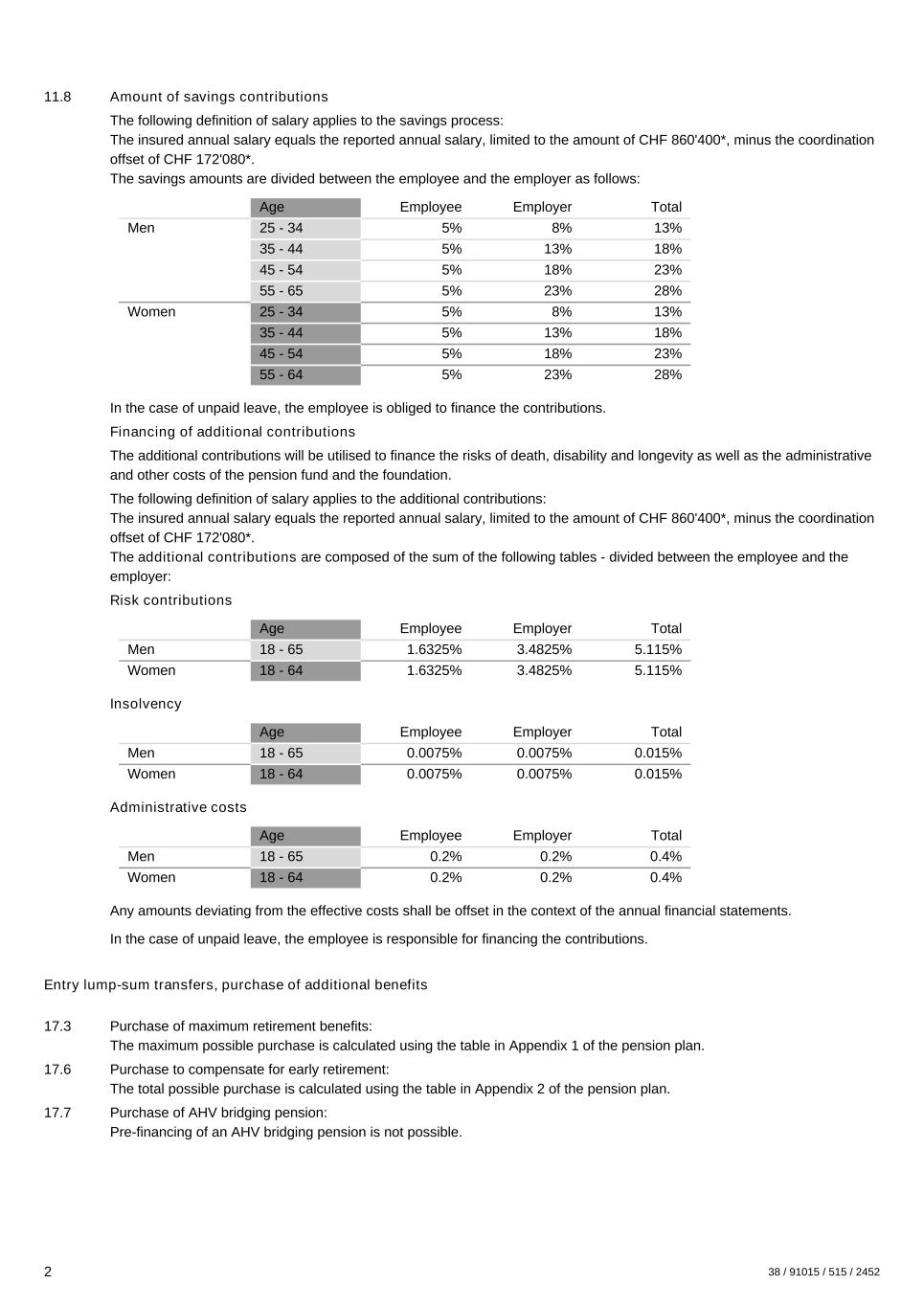 11.8 Amount of savings contributions The following definition of salary applies to the savings process: The insured annual salary equals the reported annual salary, limited to the amount of CHF 860'400*, minus the coordination offset of CHF 172'080*. The savings amounts are divided between the employee and the employer as follows: Age Employee Employer Total Men 25 - 34 5% 8% 13% 35 - 44 5% 13% 18% 45 - 54 5% 18% 23% 55 - 65 5% 23% 28% Women 25 - 34 5% 8% 13% 35 - 44 5% 13% 18% 45 - 54 5% 18% 23% 55 - 64 5% 23% 28% In the case of unpaid leave, the employee is obliged to finance the contributions. Financing of additional contributions The additional contributions will be utilised to finance the risks of death, disability and longevity as well as the administrative and other costs of the pension fund and the foundation. The following definition of salary applies to the additional contributions: The insured annual salary equals the reported annual salary, limited to the amount of CHF 860'400*, minus the coordination offset of CHF 172'080*. The additional contributions are composed of the sum of the following tables - divided between the employee and the employer: Risk contributions Age Employee Employer Total Men 18 - 65 1.6325% 3.4825% 5.115% Women 18 - 64 1.6325% 3.4825% 5.115% Insolvency Age Employee Employer Total Men 18 - 65 0.0075% 0.0075% 0.015% Women 18 - 64 0.0075% 0.0075% 0.015% Administrative costs Age Employee Employer Total Men 18 - 65 0.2% 0.2% 0.4% Women 18 - 64 0.2% 0.2% 0.4% Any amounts deviating from the effective costs shall be offset in the context of the annual financial statements. In the case of unpaid leave, the employee is responsible for financing the contributions. Entry lump-sum transfers, purchase of additional benefits 17.3 Purchase of maximum retirement benefits: The maximum possible purchase is calculated using the table in Appendix 1 of the pension plan. 17.6 Purchase to compensate for early retirement: The total possible purchase is calculated using the table in Appendix 2 of the pension plan. 17.7 Purchase of AHV bridging pension: Pre-financing of an AHV bridging pension is not possible. 2 38 / 91015 / 515 / 2452