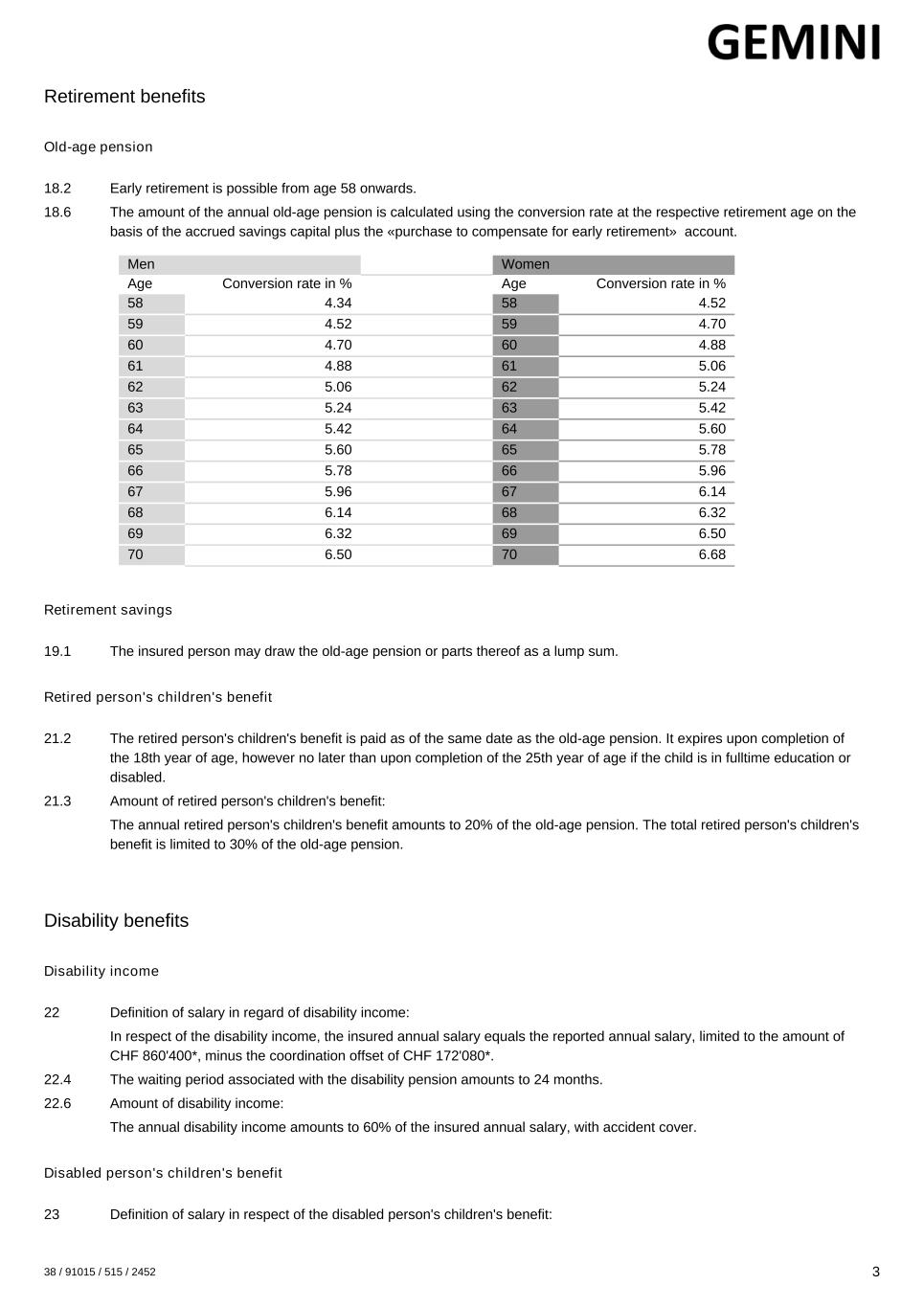 Retirement benefits Old-age pension 18.2 Early retirement is possible from age 58 onwards. 18.6 The amount of the annual old-age pension is calculated using the conversion rate at the respective retirement age on the basis of the accrued savings capital plus the «purchase to compensate for early retirement» account. Men Women Age Conversion rate in % Age Conversion rate in % 58 4.34 58 4.52 59 4.52 59 4.70 60 4.70 60 4.88 61 4.88 61 5.06 62 5.06 62 5.24 63 5.24 63 5.42 64 5.42 64 5.60 65 5.60 65 5.78 66 5.78 66 5.96 67 5.96 67 6.14 68 6.14 68 6.32 69 6.32 69 6.50 70 6.50 70 6.68 Retirement savings 19.1 The insured person may draw the old-age pension or parts thereof as a lump sum. Retired person's children's benefit 21.2 The retired person's children's benefit is paid as of the same date as the old-age pension. It expires upon completion of the 18th year of age, however no later than upon completion of the 25th year of age if the child is in fulltime education or disabled. 21.3 Amount of retired person's children's benefit: The annual retired person's children's benefit amounts to 20% of the old-age pension. The total retired person's children's benefit is limited to 30% of the old-age pension. Disability benefits Disability income 22 Definition of salary in regard of disability income: In respect of the disability income, the insured annual salary equals the reported annual salary, limited to the amount of CHF 860'400*, minus the coordination offset of CHF 172'080*. 22.4 The waiting period associated with the disability pension amounts to 24 months. 22.6 Amount of disability income: The annual disability income amounts to 60% of the insured annual salary, with accident cover. Disabled person's children's benefit 23 Definition of salary in respect of the disabled person's children's benefit: 38 / 91015 / 515 / 2452 3