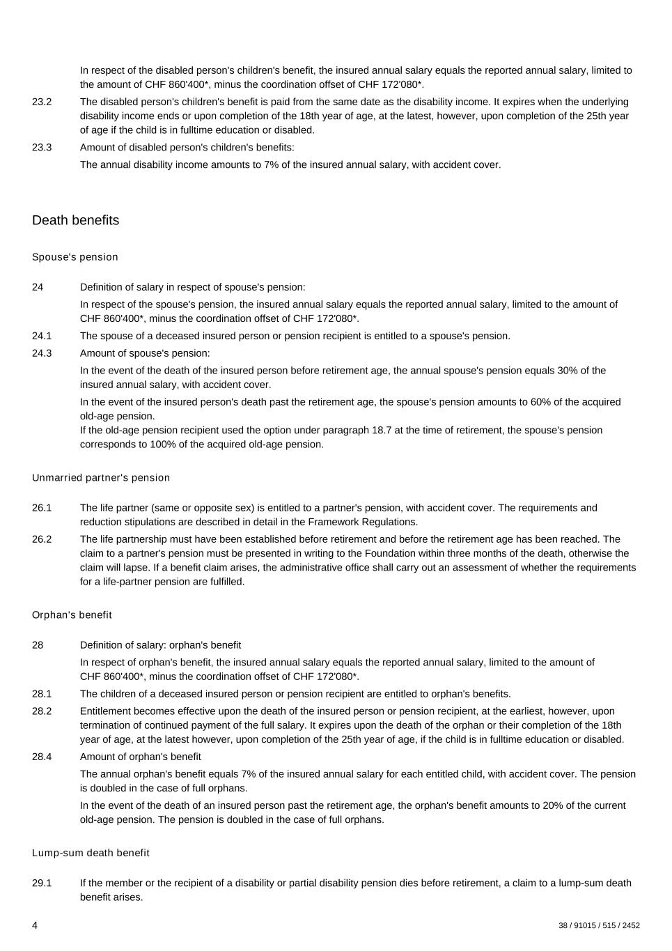 In respect of the disabled person's children's benefit, the insured annual salary equals the reported annual salary, limited to the amount of CHF 860'400*, minus the coordination offset of CHF 172'080*. 23.2 The disabled person's children's benefit is paid from the same date as the disability income. It expires when the underlying disability income ends or upon completion of the 18th year of age, at the latest, however, upon completion of the 25th year of age if the child is in fulltime education or disabled. 23.3 Amount of disabled person's children's benefits: The annual disability income amounts to 7% of the insured annual salary, with accident cover. Death benefits Spouse's pension 24 Definition of salary in respect of spouse's pension: In respect of the spouse's pension, the insured annual salary equals the reported annual salary, limited to the amount of CHF 860'400*, minus the coordination offset of CHF 172'080*. 24.1 The spouse of a deceased insured person or pension recipient is entitled to a spouse's pension. 24.3 Amount of spouse's pension: In the event of the death of the insured person before retirement age, the annual spouse's pension equals 30% of the insured annual salary, with accident cover. In the event of the insured person's death past the retirement age, the spouse's pension amounts to 60% of the acquired old-age pension. If the old-age pension recipient used the option under paragraph 18.7 at the time of retirement, the spouse's pension corresponds to 100% of the acquired old-age pension. Unmarried partner's pension 26.1 The life partner (same or opposite sex) is entitled to a partner's pension, with accident cover. The requirements and reduction stipulations are described in detail in the Framework Regulations. 26.2 The life partnership must have been established before retirement and before the retirement age has been reached. The claim to a partner's pension must be presented in writing to the Foundation within three months of the death, otherwise the claim will lapse. If a benefit claim arises, the administrative office shall carry out an assessment of whether the requirements for a life-partner pension are fulfilled. Orphan's benefit 28 Definition of salary: orphan's benefit In respect of orphan's benefit, the insured annual salary equals the reported annual salary, limited to the amount of CHF 860'400*, minus the coordination offset of CHF 172'080*. 28.1 The children of a deceased insured person or pension recipient are entitled to orphan's benefits. 28.2 Entitlement becomes effective upon the death of the insured person or pension recipient, at the earliest, however, upon termination of continued payment of the full salary. It expires upon the death of the orphan or their completion of the 18th year of age, at the latest however, upon completion of the 25th year of age, if the child is in fulltime education or disabled. 28.4 Amount of orphan's benefit The annual orphan's benefit equals 7% of the insured annual salary for each entitled child, with accident cover. The pension is doubled in the case of full orphans. In the event of the death of an insured person past the retirement age, the orphan's benefit amounts to 20% of the current old-age pension. The pension is doubled in the case of full orphans. Lump-sum death benefit 29.1 If the member or the recipient of a disability or partial disability pension dies before retirement, a claim to a lump-sum death benefit arises. 4 38 / 91015 / 515 / 2452