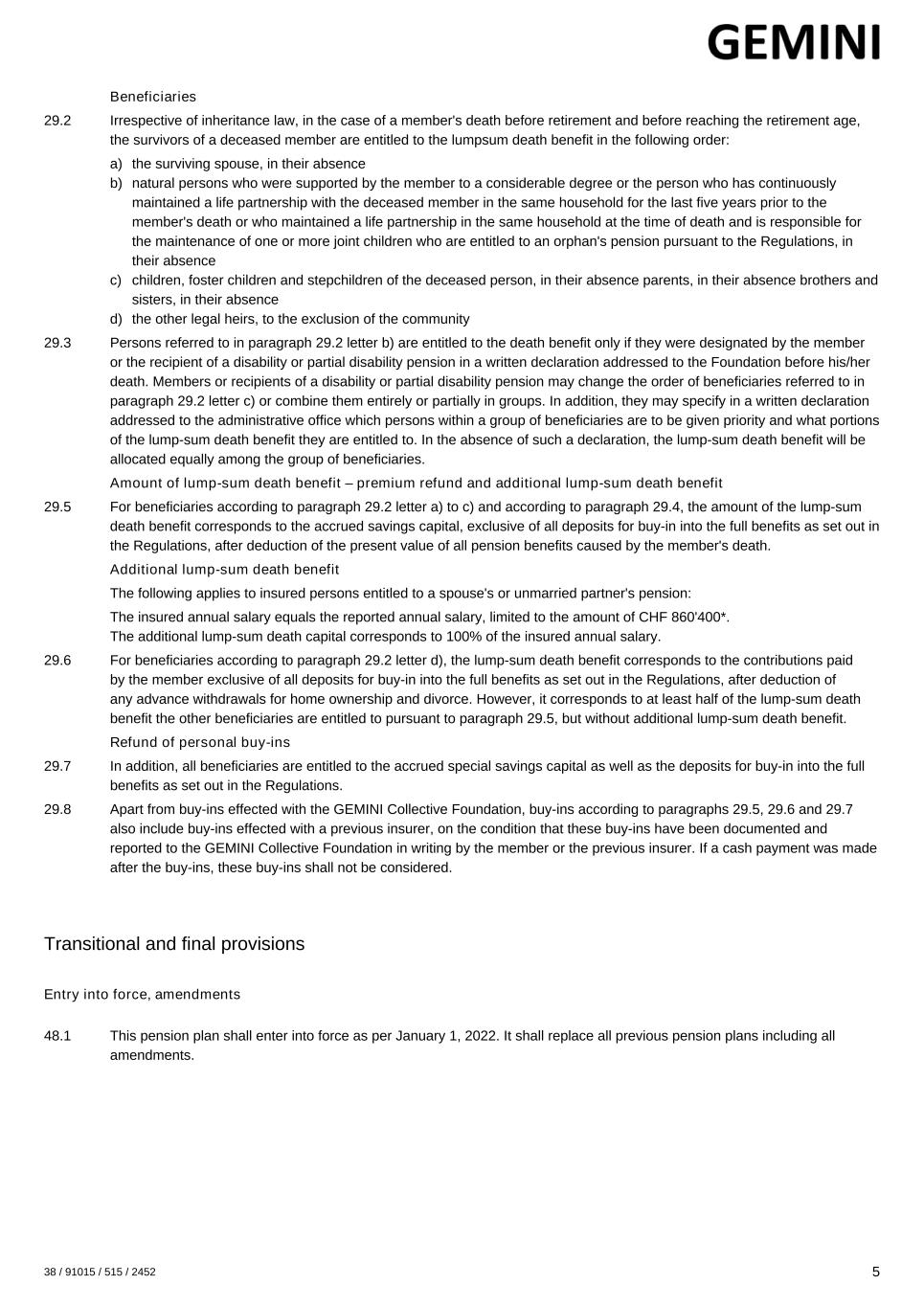 Beneficiaries 29.2 Irrespective of inheritance law, in the case of a member's death before retirement and before reaching the retirement age, the survivors of a deceased member are entitled to the lumpsum death benefit in the following order: a) the surviving spouse, in their absence b) natural persons who were supported by the member to a considerable degree or the person who has continuously maintained a life partnership with the deceased member in the same household for the last five years prior to the member's death or who maintained a life partnership in the same household at the time of death and is responsible for the maintenance of one or more joint children who are entitled to an orphan's pension pursuant to the Regulations, in their absence c) children, foster children and stepchildren of the deceased person, in their absence parents, in their absence brothers and sisters, in their absence d) the other legal heirs, to the exclusion of the community 29.3 Persons referred to in paragraph 29.2 letter b) are entitled to the death benefit only if they were designated by the member or the recipient of a disability or partial disability pension in a written declaration addressed to the Foundation before his/her death. Members or recipients of a disability or partial disability pension may change the order of beneficiaries referred to in paragraph 29.2 letter c) or combine them entirely or partially in groups. In addition, they may specify in a written declaration addressed to the administrative office which persons within a group of beneficiaries are to be given priority and what portions of the lump-sum death benefit they are entitled to. In the absence of such a declaration, the lump-sum death benefit will be allocated equally among the group of beneficiaries. Amount of lump-sum death benefit – premium refund and additional lump-sum death benefit 29.5 For beneficiaries according to paragraph 29.2 letter a) to c) and according to paragraph 29.4, the amount of the lump-sum death benefit corresponds to the accrued savings capital, exclusive of all deposits for buy-in into the full benefits as set out in the Regulations, after deduction of the present value of all pension benefits caused by the member's death. Additional lump-sum death benefit The following applies to insured persons entitled to a spouse's or unmarried partner's pension: The insured annual salary equals the reported annual salary, limited to the amount of CHF 860'400*. The additional lump-sum death capital corresponds to 100% of the insured annual salary. 29.6 For beneficiaries according to paragraph 29.2 letter d), the lump-sum death benefit corresponds to the contributions paid by the member exclusive of all deposits for buy-in into the full benefits as set out in the Regulations, after deduction of any advance withdrawals for home ownership and divorce. However, it corresponds to at least half of the lump-sum death benefit the other beneficiaries are entitled to pursuant to paragraph 29.5, but without additional lump-sum death benefit. Refund of personal buy-ins 29.7 In addition, all beneficiaries are entitled to the accrued special savings capital as well as the deposits for buy-in into the full benefits as set out in the Regulations. 29.8 Apart from buy-ins effected with the GEMINI Collective Foundation, buy-ins according to paragraphs 29.5, 29.6 and 29.7 also include buy-ins effected with a previous insurer, on the condition that these buy-ins have been documented and reported to the GEMINI Collective Foundation in writing by the member or the previous insurer. If a cash payment was made after the buy-ins, these buy-ins shall not be considered. Transitional and final provisions Entry into force, amendments 48.1 This pension plan shall enter into force as per January 1, 2022. It shall replace all previous pension plans including all amendments. 38 / 91015 / 515 / 2452 5