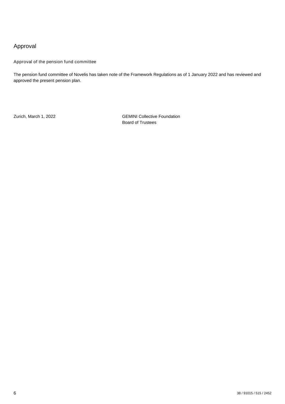 Approval Approval of the pension fund committee The pension fund committee of Novelis has taken note of the Framework Regulations as of 1 January 2022 and has reviewed and approved the present pension plan. Zurich, March 1, 2022 GEMINI Collective Foundation Board of Trustees 6 38 / 91015 / 515 / 2452