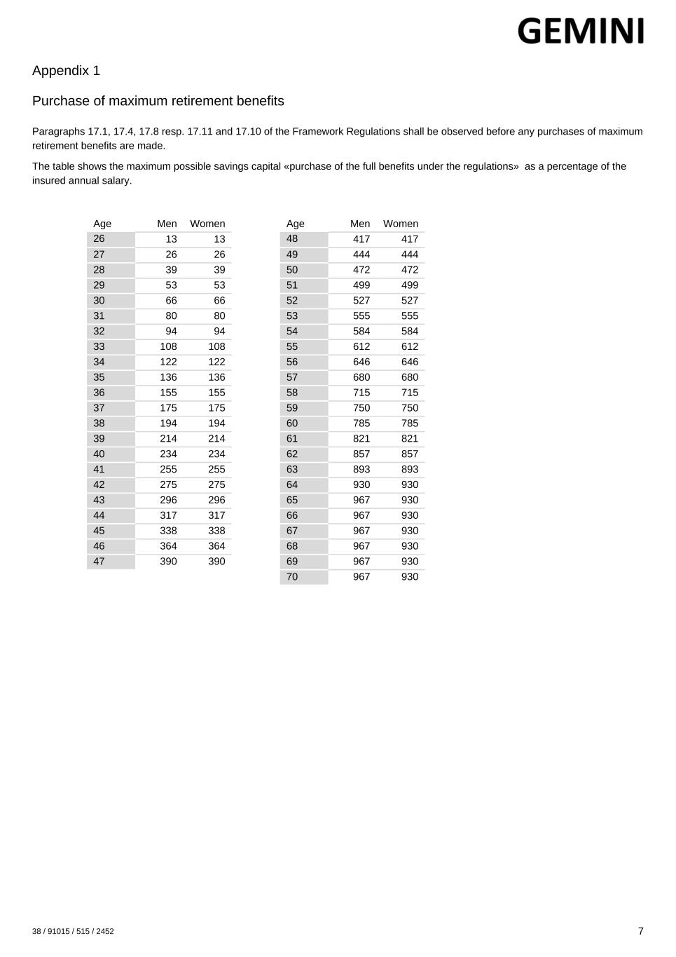 Appendix 1 Purchase of maximum retirement benefits Paragraphs 17.1, 17.4, 17.8 resp. 17.11 and 17.10 of the Framework Regulations shall be observed before any purchases of maximum retirement benefits are made. The table shows the maximum possible savings capital «purchase of the full benefits under the regulations» as a percentage of the insured annual salary. Age Men Women 26 13 13 27 26 26 28 39 39 29 53 53 30 66 66 31 80 80 32 94 94 33 108 108 34 122 122 35 136 136 36 155 155 37 175 175 38 194 194 39 214 214 40 234 234 41 255 255 42 275 275 43 296 296 44 317 317 45 338 338 46 364 364 47 390 390 Age Men Women 48 417 417 49 444 444 50 472 472 51 499 499 52 527 527 53 555 555 54 584 584 55 612 612 56 646 646 57 680 680 58 715 715 59 750 750 60 785 785 61 821 821 62 857 857 63 893 893 64 930 930 65 967 930 66 967 930 67 967 930 68 967 930 69 967 930 70 967 930 38 / 91015 / 515 / 2452 7