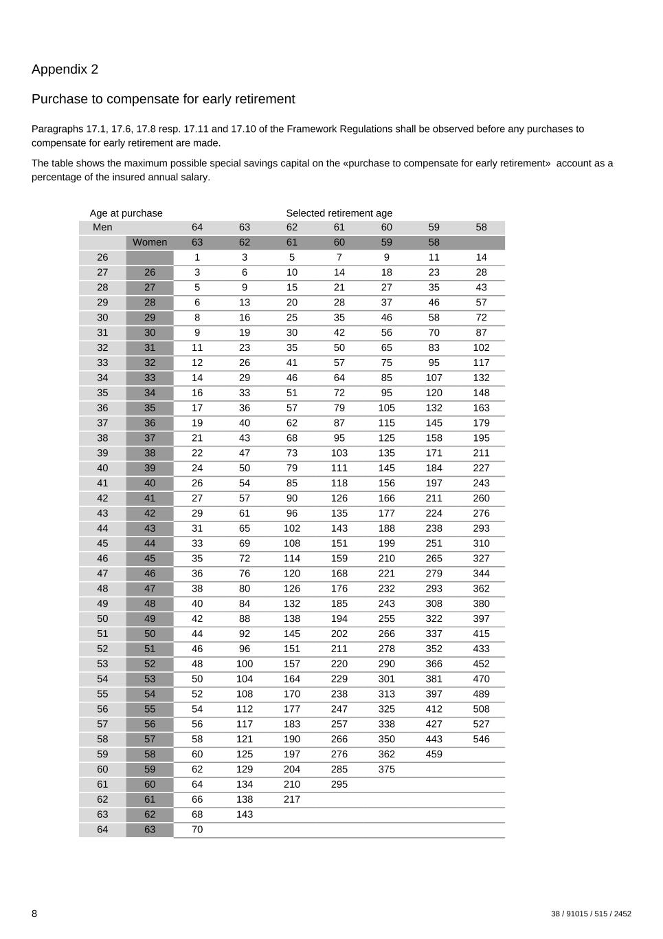 Appendix 2 Purchase to compensate for early retirement Paragraphs 17.1, 17.6, 17.8 resp. 17.11 and 17.10 of the Framework Regulations shall be observed before any purchases to compensate for early retirement are made. The table shows the maximum possible special savings capital on the «purchase to compensate for early retirement» account as a percentage of the insured annual salary. Age at purchase Selected retirement age Men 64 63 62 61 60 59 58 Women 63 62 61 60 59 58 26 1 3 5 7 9 11 14 27 26 3 6 10 14 18 23 28 28 27 5 9 15 21 27 35 43 29 28 6 13 20 28 37 46 57 30 29 8 16 25 35 46 58 72 31 30 9 19 30 42 56 70 87 32 31 11 23 35 50 65 83 102 33 32 12 26 41 57 75 95 117 34 33 14 29 46 64 85 107 132 35 34 16 33 51 72 95 120 148 36 35 17 36 57 79 105 132 163 37 36 19 40 62 87 115 145 179 38 37 21 43 68 95 125 158 195 39 38 22 47 73 103 135 171 211 40 39 24 50 79 111 145 184 227 41 40 26 54 85 118 156 197 243 42 41 27 57 90 126 166 211 260 43 42 29 61 96 135 177 224 276 44 43 31 65 102 143 188 238 293 45 44 33 69 108 151 199 251 310 46 45 35 72 114 159 210 265 327 47 46 36 76 120 168 221 279 344 48 47 38 80 126 176 232 293 362 49 48 40 84 132 185 243 308 380 50 49 42 88 138 194 255 322 397 51 50 44 92 145 202 266 337 415 52 51 46 96 151 211 278 352 433 53 52 48 100 157 220 290 366 452 54 53 50 104 164 229 301 381 470 55 54 52 108 170 238 313 397 489 56 55 54 112 177 247 325 412 508 57 56 56 117 183 257 338 427 527 58 57 58 121 190 266 350 443 546 59 58 60 125 197 276 362 459 60 59 62 129 204 285 375 61 60 64 134 210 295 62 61 66 138 217 63 62 68 143 64 63 70 8 38 / 91015 / 515 / 2452
