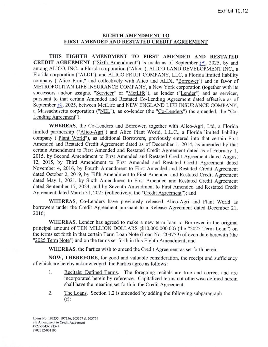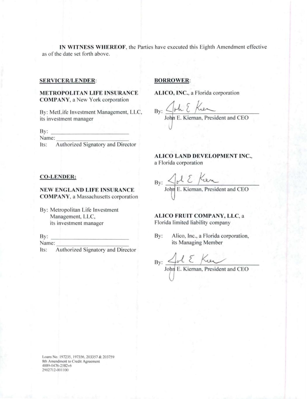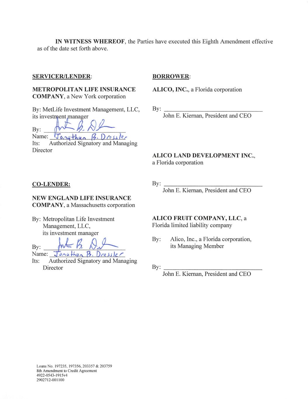 IN WITNESS WHEREOF, the Parties have executed this Eighth Amendment effective as of the date set forth above. SERVICER/LENDER: BORROWER: METROPOLITAN LIFE INSURANCE ALICO, INC., a Florida corporation COMPANY, a New York corporation By: MetLife Investment Management, LLC. its investment manager By: Name: Its: Authorized Signatory and Director CO-LENDER: NEW ENGLAND LIFE INSURANCE COMPANY, a Massachusetts corporation By: Metropolitan Life Investment Management, LLC, its investment manager By: Name: Its: Authorized Signatory and Director Loans No. 197235, 197356, 203357 & 203759 8th Amendment to Credit Agreement 4889-0476-2582v6 2902712-001100 By: ohji E. Kiernan, President and CEO ALICO LAND DEVELOPMENT INC., a Florida corporation By: ohd E. Kiernan, President and CEO ALICO FRUIT COMPANY, LLC, a Florida limited liability company By: Alico, Inc., a Florida corporation, its Managing Member By: ,1 E Johr1 E. Kiernan, President and CEO