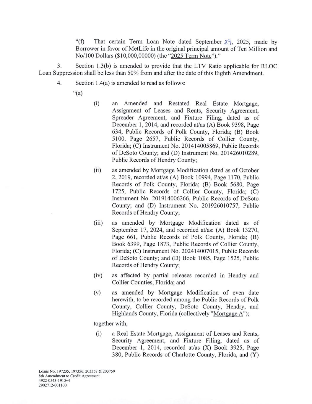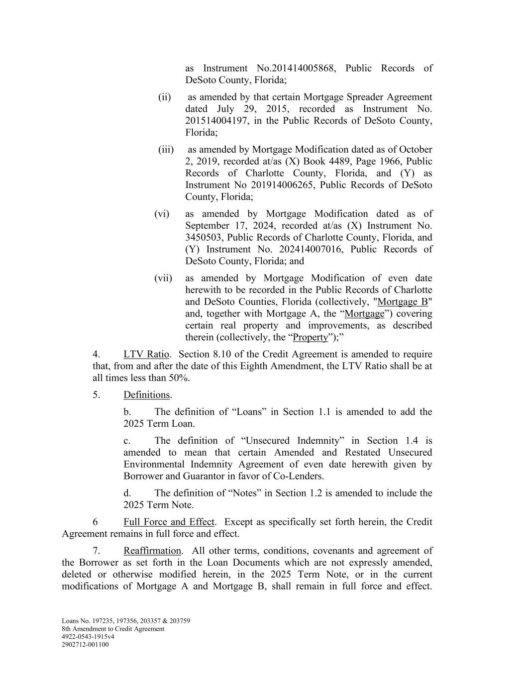 Loans No. 197235, 197356, 203357 & 203759 8th Amendment to Credit Agreement 4922-0543-1915v4 2902712-001100 as Instrument No.201414005868, Public Records of DeSoto County, Florida; (ii) as amended by that certain Mortgage Spreader Agreement dated July 29, 2015, recorded as Instrument No. 201514004197, in the Public Records of DeSoto County, Florida; (iii) as amended by Mortgage Modification dated as of October 2, 2019, recorded at/as (X) Book 4489, Page 1966, Public Records of Charlotte County, Florida, and (Y) as Instrument No 201914006265, Public Records of DeSoto County, Florida; (vi) as amended by Mortgage Modification dated as of September 17, 2024, recorded at/as (X) Instrument No. 3450503, Public Records of Charlotte County, Florida, and (Y) Instrument No. 202414007016, Public Records of DeSoto County, Florida; and (vii) as amended by Mortgage Modification of even date herewith to be recorded in the Public Records of Charlotte and DeSoto Counties, Florida (collectively, "Mortgage B" and, together with Mortgage A, the “Mortgage”) covering certain real property and improvements, as described therein (collectively, the “Property”);” 4. LTV Ratio. Section 8.10 of the Credit Agreement is amended to require that, from and after the date of this Eighth Amendment, the LTV Ratio shall be at all times less than 50%. 5. Definitions. b. The definition of “Loans” in Section 1.1 is amended to add the 2025 Term Loan. c. The definition of “Unsecured Indemnity” in Section 1.4 is amended to mean that certain Amended and Restated Unsecured Environmental Indemnity Agreement of even date herewith given by Borrower and Guarantor in favor of Co-Lenders. d. The definition of “Notes” in Section 1.2 is amended to include the 2025 Term Note. 6 Full Force and Effect. Except as specifically set forth herein, the Credit Agreement remains in full force and effect. 7. Reaffirmation. All other terms, conditions, covenants and agreement of the Borrower as set forth in the Loan Documents which are not expressly amended, deleted or otherwise modified herein, in the 2025 Term Note, or in the current modifications of Mortgage A and Mortgage B, shall remain in full force and effect.