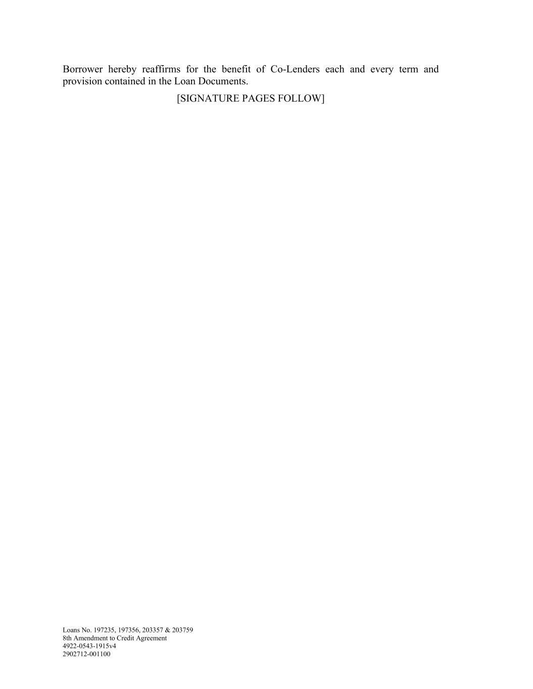 Loans No. 197235, 197356, 203357 & 203759 8th Amendment to Credit Agreement 4922-0543-1915v4 2902712-001100 Borrower hereby reaffirms for the benefit of Co-Lenders each and every term and provision contained in the Loan Documents. [SIGNATURE PAGES FOLLOW]