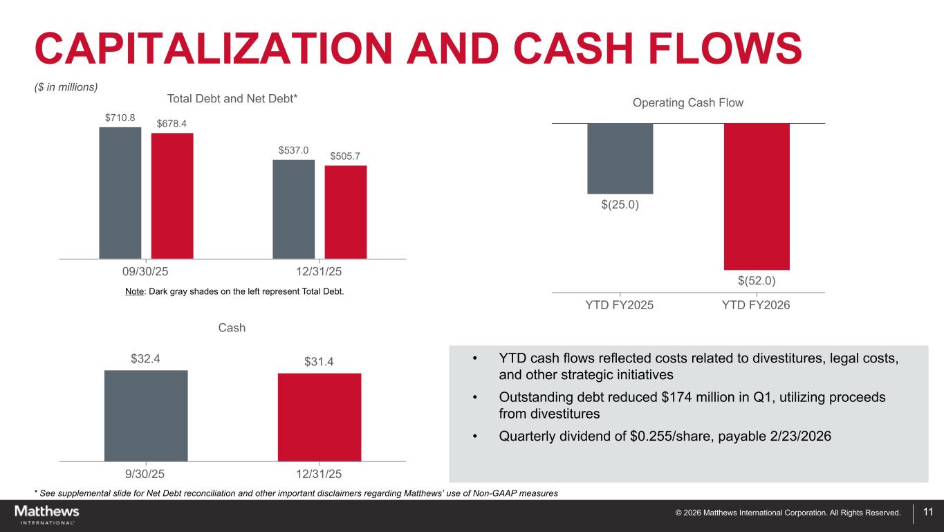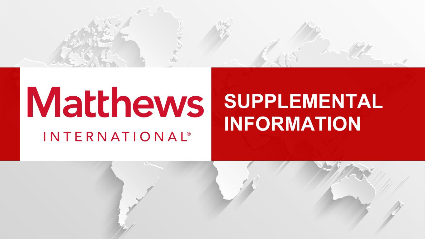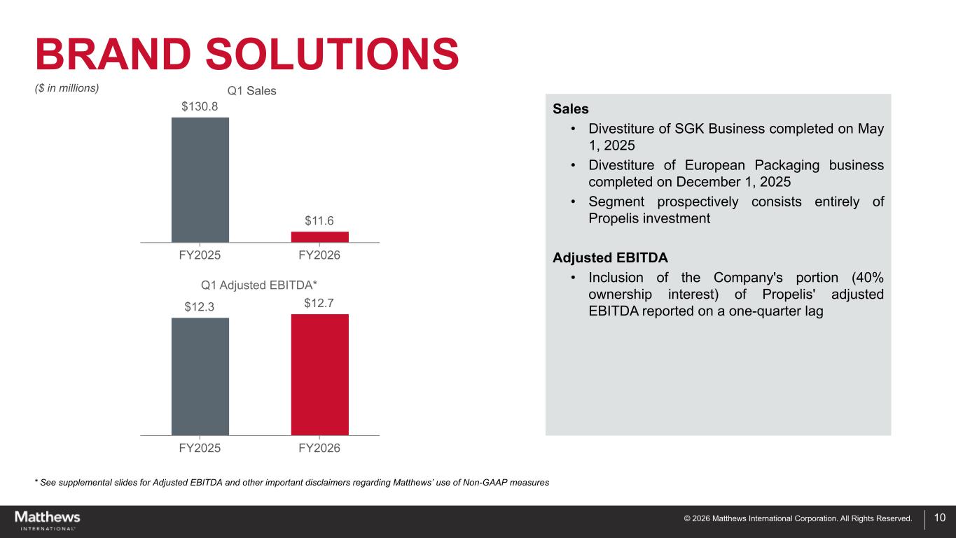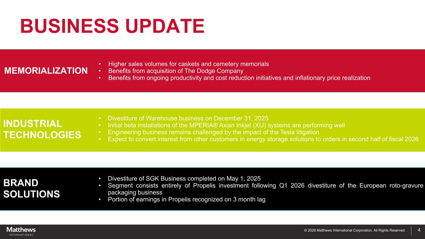 © 2026 Matthews International Corporation. All Rights Reserved. DISCLAIMER 2 Any forward-looking statements contained in this release are included pursuant to the “safe harbor” provisions of the Private Securities Litigation Reform Act of 1995. These forward-looking statements include, but are not limited to, statements regarding the expectations, hopes, beliefs, intentions or strategies of Matthews International Corporation and its consolidated subsidiaries (collectively “Matthews” or the “Company”) regarding the future, including statements regarding the anticipated benefits and risks associated with the joint venture transaction with Peninsula Parent LLC, d.b.a. Propelis Group ("Propelis") and the timing thereof, and may be identified by the use of words such as “expects,” “believes,” “intends,” “projects,” “anticipates,” “estimates,” “plans,” “seeks,” “forecasts,” “predicts,” “objective,” “targets,” “potential,” “outlook,” “may,” “will,” “could” or the negative of these terms, other comparable terminology and variations thereof. Such forward-looking statements involve known and unknown risks and uncertainties that may cause the Company's actual results in future periods to be materially different from management's expectations, and no assurance can be given that such expectations will prove correct. Factors that could cause the Company's results to differ materially from the results discussed in such forward-looking statements principally include risks to our ability to achieve the anticipated benefits of the joint venture transaction with Propelis that closed in fiscal year 2025, changes in domestic or international economic conditions, changes in foreign currency exchange rates, changes in interest rates, changes in the cost of materials used in the manufacture of the Company's products, including changes in costs due to adjustments to tariffs, any impairment of goodwill or intangible assets, environmental liability and limitations on the Company’s operations due to environmental laws and regulations, disruptions to certain services, such as telecommunications, network server maintenance, cloud computing or transaction processing services, provided to the Company by third-parties, changes in mortality and cremation rates, changes in product demand or pricing as a result of consolidation in the industries in which the Company operates, or other factors such as supply chain disruptions, labor shortages or labor cost increases, changes in product demand or pricing as a result of domestic or international competitive pressures, ability to achieve cost-reduction objectives, unknown risks in connection with the Company's acquisitions, divestitures, and business combinations, cybersecurity concerns and costs arising with management of cybersecurity threats, effectiveness of the Company's internal controls, compliance with domestic and foreign laws and regulations, technological factors beyond the Company's control, impact of pandemics or similar outbreaks, or other disruptions to our industries, customers, or supply chains, the impact of global conflicts, such as the current war between Russia and Ukraine, and conflicts and related sanctions or trade restrictions involving Venezuela, the Company's plans and expectations with respect to its exploration, and contemplated execution, of various strategies with respect to its portfolio of businesses, the Company's plans and expectations with respect to its Board of Directors, and other factors described in the Company’s Annual Report on Form 10-K and other periodic filings with the U.S. Securities and Exchange Commission. Included in this report are measures of financial performance that are not defined by generally accepted accounting principles in the United States (“GAAP”). The Company uses non-GAAP financial measures to assist in comparing its performance on a consistent basis for purposes of business decision-making by removing the impact of certain items that management believes do not directly reflect the Company’s core operations including acquisition and divestiture costs, enterprise resource planning ("ERP") system integration costs, strategic initiative and other charges (which includes non-recurring charges related to certain commercial and operational initiatives and exit activities), stock-based compensation and the non-service portion of pension and postretirement expense. Management believes that presenting non-GAAP financial measures is useful to investors because it (i) provides investors with meaningful supplemental information regarding financial performance by excluding certain items that management believes do not directly reflect the Company’s core operations, (ii) permits investors to view performance using the same tools that management uses to budget, forecast, make operating and strategic decisions, and evaluate historical performance, and (iii) otherwise provides supplemental information that may be useful to investors in evaluating the Company’s results. The Company believes that the presentation of these non-GAAP financial measures, when considered together with the corresponding GAAP financial measures and the reconciliations to those measures, provided herein, provides investors with an additional understanding of the factors and trends affecting the Company’s business that could not be obtained absent these disclosures. The Company believes that adjusted EBITDA provides relevant and useful information, which is used by the Company’s management in assessing the performance of its business. Adjusted EBITDA is defined by the Company as earnings before interest, income taxes, depreciation, amortization and certain non-cash and/or non-recurring items that do not contribute directly to management’s evaluation of its operating results. These items include stock-based compensation, the non-service portion of pension and