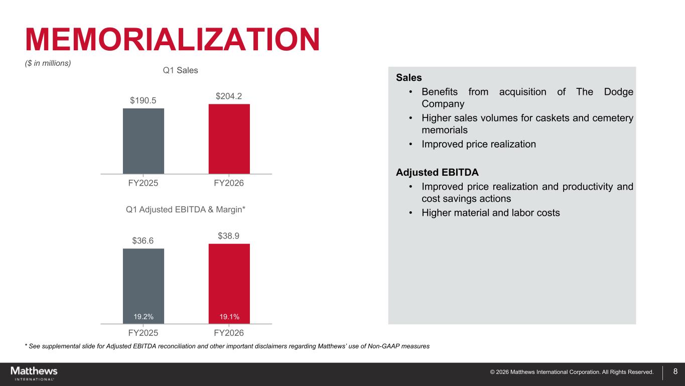 © 2026 Matthews International Corporation. All Rights Reserved. Q1 2026 SUMMARY 7 ($ in millions except per-share amounts) Q1 Q1 2025 Q1 2026 Sales $ 401.8 $ 284.8 Diluted (loss) earnings per share $ (0.11) $ 1.39 Non-GAAP Adjusted EPS* $ 0.14 $ (0.19) Net (loss) income attributable to Matthews $ (3.5) $ 43.6 Adjusted EBITDA* $ 40.0 $ 35.2 Highlights Sales • Higher sales for Memorialization segment for the current quarter, primarily reflecting the recent acquisition of The Dodge Company • Lower engineering sales • Divestiture of SGK Business completed on May 1, 2025 GAAP EPS • Net gain on divestitures of Warehouse and European packaging and tooling businesses • Higher litigation and other strategic initiative costs Adjusted EPS • Lower adjusted EBITDA • Unfavorable impact of foreign losses with no tax benefit Adjusted EBITDA • Lower adjusted EBITDA for the Industrial Technologies segment offset partially by higher adjusted EBITDA for the Memorialization segment * See supplemental slides for Adjusted EPS, Adjusted EBITDA, constant currency sales, constant currency adjusted EBITDA reconciliations and other important disclaimers regarding Matthews’ use of Non-GAAP measures