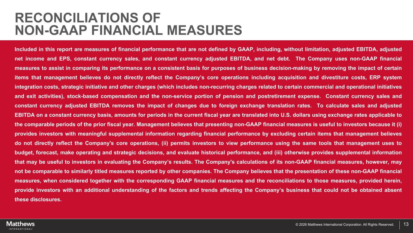 © 2026 Matthews International Corporation. All Rights Reserved. 13 Included in this report are measures of financial performance that are not defined by GAAP, including, without limitation, adjusted EBITDA, adjusted net income and EPS, constant currency sales, and constant currency adjusted EBITDA, and net debt. The Company uses non-GAAP financial measures to assist in comparing its performance on a consistent basis for purposes of business decision-making by removing the impact of certain items that management believes do not directly reflect the Company’s core operations including acquisition and divestiture costs, ERP system integration costs, strategic initiative and other charges (which includes non-recurring charges related to certain commercial and operational initiatives and exit activities), stock-based compensation and the non-service portion of pension and postretirement expense. Constant currency sales and constant currency adjusted EBITDA removes the impact of changes due to foreign exchange translation rates. To calculate sales and adjusted EBITDA on a constant currency basis, amounts for periods in the current fiscal year are translated into U.S. dollars using exchange rates applicable to the comparable periods of the prior fiscal year. Management believes that presenting non-GAAP financial measures is useful to investors because it (i) provides investors with meaningful supplemental information regarding financial performance by excluding certain items that management believes do not directly reflect the Company's core operations, (ii) permits investors to view performance using the same tools that management uses to budget, forecast, make operating and strategic decisions, and evaluate historical performance, and (iii) otherwise provides supplemental information that may be useful to investors in evaluating the Company’s results. The Company's calculations of its non-GAAP financial measures, however, may not be comparable to similarly titled measures reported by other companies. The Company believes that the presentation of these non-GAAP financial measures, when considered together with the corresponding GAAP financial measures and the reconciliations to those measures, provided herein, provide investors with an additional understanding of the factors and trends affecting the Company’s business that could not be obtained absent these disclosures. RECONCILIATIONS OF NON-GAAP FINANCIAL MEASURES