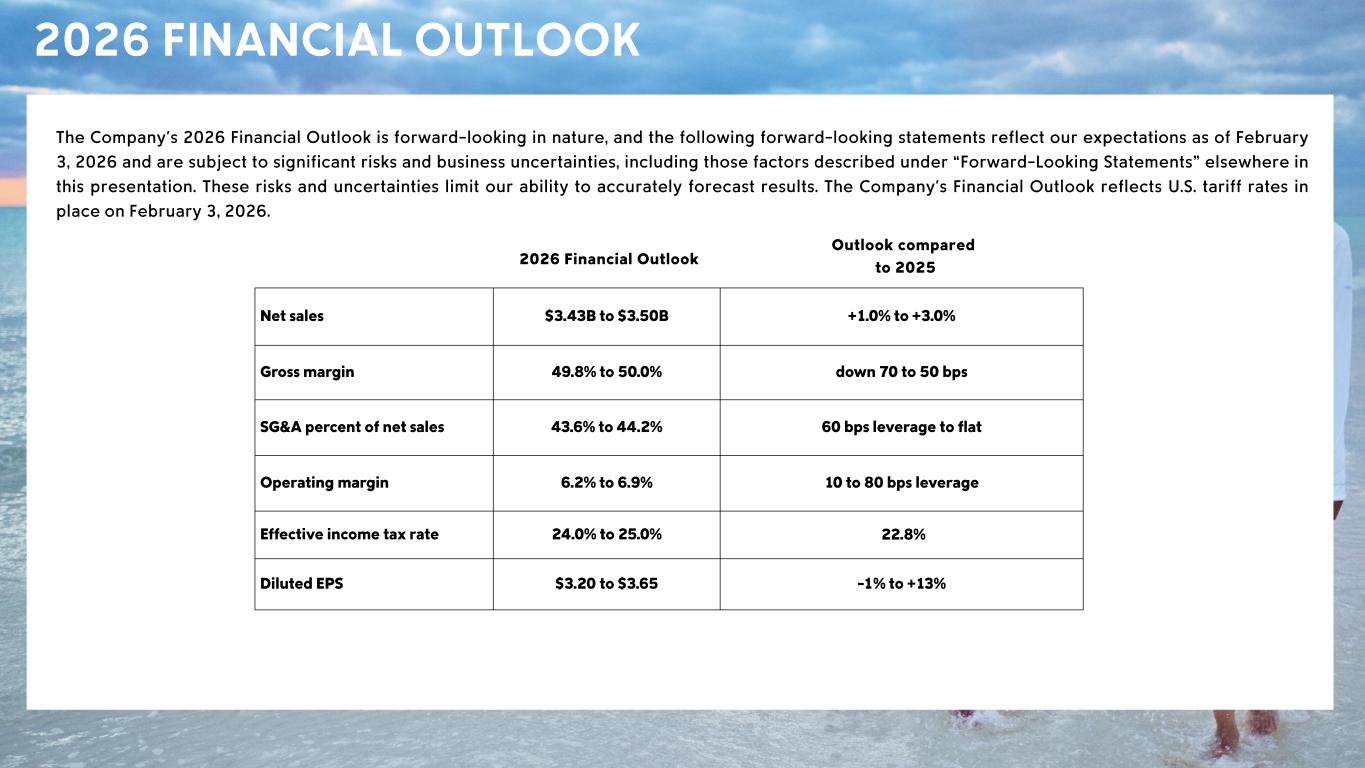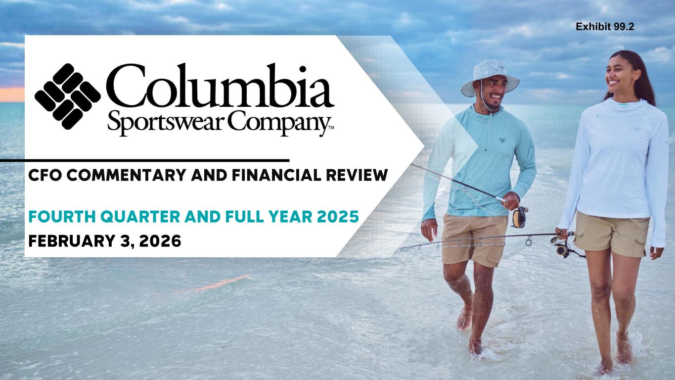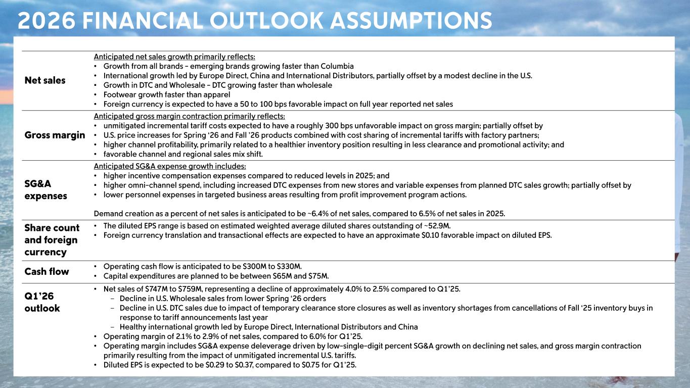 CSC Confidential – Sensitive Information 2026 FINANCIAL OUTLOOK ASSUMPTIONS Net sales Anticipated net sales growth primarily reflects: • Growth from all brands - emerging brands growing faster than Columbia • International growth led by Europe Direct, China and International Distributors, partially offset by a modest decline in the U.S. • Growth in DTC and Wholesale - DTC growing faster than wholesale • Footwear growth faster than apparel • Foreign currency is expected to have a 50 to 100 bps favorable impact on full year reported net sales Gross margin Anticipated gross margin contraction primarily reflects: • unmitigated incremental tariff costs expected to have a roughly 300 bps unfavorable impact on gross margin; partially offset by • U.S. price increases for Spring ‘26 and Fall ’26 products combined with cost sharing of incremental tariffs with factory part ner s; • higher channel profitability, primarily related to a healthier inventory position resulting in less clearance and promotional ac tivity; and • favorable channel and regional sales mix shift. SG&A expenses Anticipated SG&A expense growth includes: • higher incentive compensation expenses compared to reduced levels in 2025; and • higher omni - channel spend, including increased DTC expenses from new stores and variable expenses from planned DTC sales growth; partially offset by • lower personnel expenses in targeted business areas resulting from profit improvement program actions. Demand creation as a percent of net sales is anticipated to be ~6.4% of net sales, compared to 6.5% of net sales in 2025. Share count and foreign currency • The diluted EPS range is based on estimated weighted average diluted shares outstanding of ~52.9M. • Foreign currency translation and transactional effects are expected to have an approximate $0.10 favorable impact on diluted EPS. Cash flow • Operating cash flow is anticipated to be $300M to $330M. • Capital expenditures are planned to be between $65M and $75M. Q1’26 outlook • Net sales of $747M to $759M, representing a decline of approximately 4.0% to 2.5% compared to Q1’25. - Decline in U.S. Wholesale sales from lower Spring ‘26 orders - Decline in U.S. DTC sales due to impact of temporary clearance store closures as well as inventory shortages from cancellatio ns of Fall ‘25 inventory buys in response to tariff announcements last year - Healthy international growth led by Europe Direct, International Distributors and China • Operating margin of 2.1% to 2.9% of net sales, compared to 6.0% for Q1’25. • Operating margin includes SG&A expense deleverage driven by low - single - digit percent SG&A growth on declining net sales, and gro ss margin contraction primarily resulting from the impact of unmitigated incremental U.S. tariffs. • Diluted EPS is expected to be $0.29 to $0.37, compared to $0.75 for Q1’25.