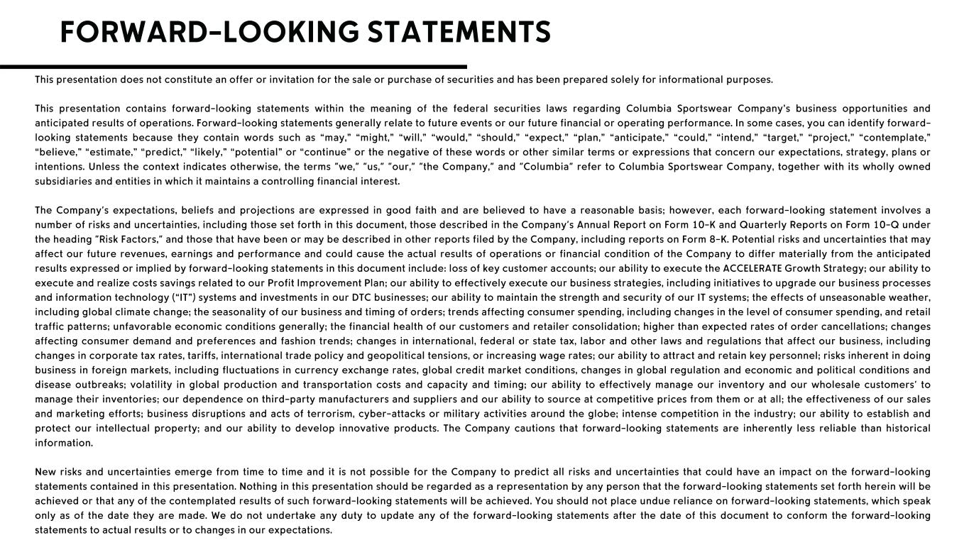 This presentation does not constitute an offer or invitation for the sale or purchase of securities and has been prepared solely for informational purposes . This presentation contains forward - looking statements within the meaning of the federal securities laws regarding Columbia Sportswear Company’s business opportunities and anticipated results of operations . Forward - looking statements generally relate to future events or our future financial or operating performance . In some cases, you can identify forward - looking statements because they contain words such as “may,” “might,” “will,” “would,” “should,” “expect,” “plan,” “anticipate,” “could,” “intend,” “target,” “project,” “contemplate,” “believe,” “estimate,” “predict,” “likely,” “potential” or “continue” or the negative of these words or other similar terms or expressions that concern our expectations, strategy, plans or intentions . Unless the context indicates otherwise, the terms "we," "us," "our," "the Company," and "Columbia" refer to Columbia Sportswear Company, together with its wholly owned subsidiaries and entities in which it maintains a controlling financial interest . The Company's expectations, beliefs and projections are expressed in good faith and are believed to have a reasonable basis ; however, each forward - looking statement involves a number of risks and uncertainties, including those set forth in this document, those described in the Company's Annual Report on Form 10 - K and Quarterly Reports on Form 10 - Q under the heading "Risk Factors," and those that have been or may be described in other reports filed by the Company, including reports on Form 8 - K. Potential risks and uncertainties that may affect our future revenues, earnings and performance and could cause the actual results of operations or financial condition of the Company to differ materially from the anticipated results expressed or implied by forward - looking statements in this document include : loss of key customer accounts ; our ability to execute the ACCELERATE Growth Strategy ; our ability to execute and realize costs savings related to our Profit Improvement Plan ; our ability to effectively execute our business strategies, including initiatives to upgrade our business processes and information technology (“IT”) systems and investments in our DTC businesses ; our ability to maintain the strength and security of our IT systems ; the effects of unseasonable weather, including global climate change ; the seasonality of our business and timing of orders ; trends affecting consumer spending, including changes in the level of consumer spending, and retail traffic patterns ; unfavorable economic conditions generally ; the financial health of our customers and retailer consolidation ; higher than expected rates of order cancellations ; changes affecting consumer demand and preferences and fashion trends ; changes in international, federal or state tax, labor and other laws and regulations that affect our business, including changes in corporate tax rates, tariffs, international trade policy and geopolitical tensions, or increasing wage rates ; our ability to attract and retain key personnel ; risks inherent in doing business in foreign markets, including fluctuations in currency exchange rates, global credit market conditions, changes in global regulation and economic and political conditions and disease outbreaks ; volatility in global production and transportation costs and capacity and timing ; our ability to effectively manage our inventory and our wholesale customers' to manage their inventories ; our dependence on third - party manufacturers and suppliers and our ability to source at competitive prices from them or at all ; the effectiveness of our sales and marketing efforts ; business disruptions and acts of terrorism, cyber - attacks or military activities around the globe ; intense competition in the industry ; our ability to establish and protect our intellectual property ; and our ability to develop innovative products . The Company cautions that forward - looking statements are inherently less reliable than historical information . New risks and uncertainties emerge from time to time and it is not possible for the Company to predict all risks and uncertainties that could have an impact on the forward - looking statements contained in this presentation . Nothing in this presentation should be regarded as a representation by any person that the forward - looking statements set forth herein will be achieved or that any of the contemplated results of such forward - looking statements will be achieved . You should not place undue reliance on forward - looking statements, which speak only as of the date they are made . We do not undertake any duty to update any of the forward - looking statements after the date of this document to conform the forward - looking statements to actual results or to changes in our expectations . FORWARD - LOOKING STATEMENTS