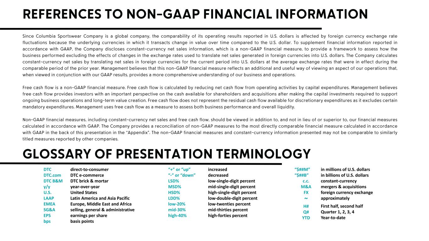 Since Columbia Sportswear Company is a global company, the comparability of its operating results reported in U.S. dollars is affected by foreign currency exchange rate fluctuations because the underlying currencies in which it transacts change in value over time compared to the U.S. dollar . To supplement financial information reported in accordance with GAAP, the Company discloses constant - currency net sales information, which is a non - GAAP financial measure, to provide a framework to assess how the business performed excluding the effects of changes in the exchange rates used to translate net sales generated in foreign currencies into U.S. dollars . The Company calculates constant - currency net sales by translating net sales in foreign currencies for the current period into U.S. dollars at the average exchange rates that were in effect during the comparable period of the prior year . Management believes that this non - GAAP financial measure reflects an additional and useful way of viewing an aspect of our operations that, when viewed in conjunction with our GAAP results, provides a more comprehensive understanding of our business and operations . Free cash flow is a non - GAAP financial measure . Free cash flow is calculated by reducing net cash flow from operating activities by capital expenditures . Management believes free cash flow provides investors with an important perspective on the cash available for shareholders and acquisitions after making the capital investments required to support ongoing business operations and long - term value creation . Free cash flow does not represent the residual cash flow available for discretionary expenditures as it excludes certain mandatory expenditures . Management uses free cash flow as a measure to assess both business performance and overall liquidity . Non - GAAP financial measures, including constant - currency net sales and free cash flow, should be viewed in addition to, and not in lieu of or superior to, our financial measures calculated in accordance with GAAP . The Company provides a reconciliation of non - GAAP measures to the most directly comparable financial measure calculated in accordance with GAAP in the back of this presentation in the “Appendix” . The non - GAAP financial measures and constant - currency information presented may not be comparable to similarly titled measures reported by other companies . REFERENCES TO NON - GAAP FINANCIAL INFORMATION GLOSSARY OF PRESENTATION TERMINOLOGY DTC DTC.com DTC B&M y/y U.S. LAAP EMEA SG&A EPS bps direct-to-consumer DTC e-commerce DTC brick & mortar year-over-year United States Latin America and Asia Pacific Europe, Middle East and Africa selling, general & administrative earnings per share basis points “+” or “up” “-” or “down” LSD% MSD% HSD% LDD% low-20% mid-30% high-40% increased decreased low-single-digit percent mid-single-digit percent high-single-digit percent low-double-digit percent low-twenties percent mid-thirties percent high-forties percent “$##M” “$##B” c.c. M&A FX ~ H# Q# YTD in millions of U.S. dollars in billions of U.S. dollars constant-currency mergers & acquisitions foreign currency exchange approximately First half, second half Quarter 1, 2, 3, 4 Year-to-date