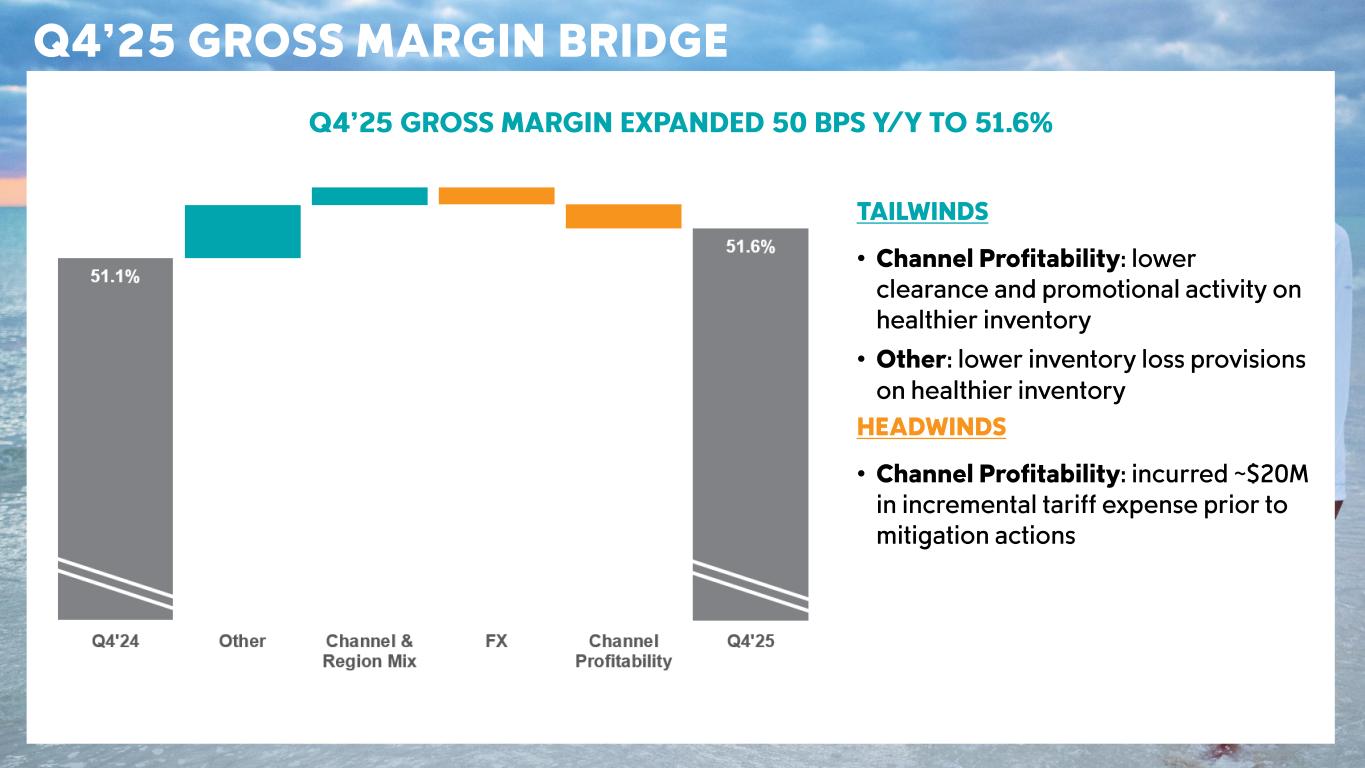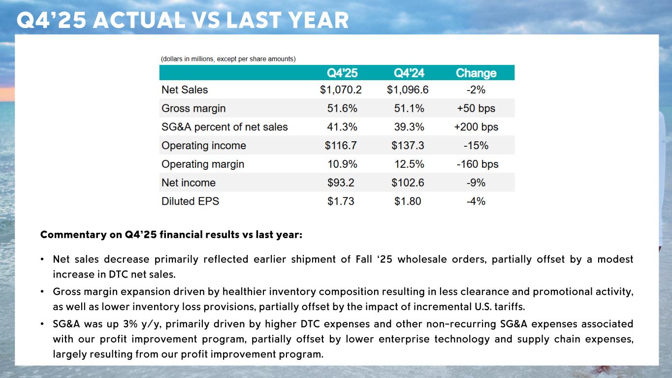 CSC Confidential – Sensitive Information Q4’25 ACTUAL VS LAST YEAR Commentary on Q 4 ’25 financial results vs last year : • Net sales decrease primarily reflected earlier shipment of Fall ‘25 wholesale orders, partially offset by a modest increase in DTC net sales . • Gross margin expansion driven by healthier inventory composition resulting in less clearance and promotional activity, as well as lower inventory loss provisions, partially offset by the impact of incremental U.S. tariffs . • SG&A was up 3% y/y, primarily driven by higher DTC expenses and other non - recurring SG&A expenses associated with our profit improvement program, partially offset by lower enterprise technology and supply chain expenses, largely resulting from our profit improvement program .