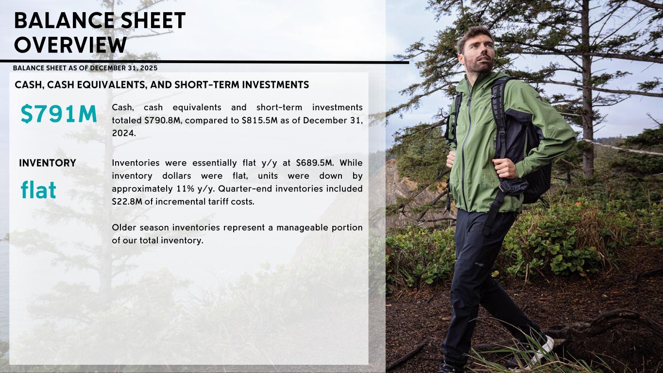 BALANCE SHEET OVERVIEW Cash, cash equivalents and short - term investments totaled $790 .8M, compared to $815 .5M as of December 31 , 2024 . $791M flat BALANCE SHEET AS OF DECEMBER 31 , 2025 INVENTORY CASH, CASH EQUIVALENTS, AND SHORT - TERM INVESTMENTS Inventories were essentially flat y/y at $689 .5M. While inventory dollars were flat, units were down by approximately 11 % y/y . Quarter - end inventories included $22 .8M of incremental tariff costs . Older season inventories represent a manageable portion of our total inventory .