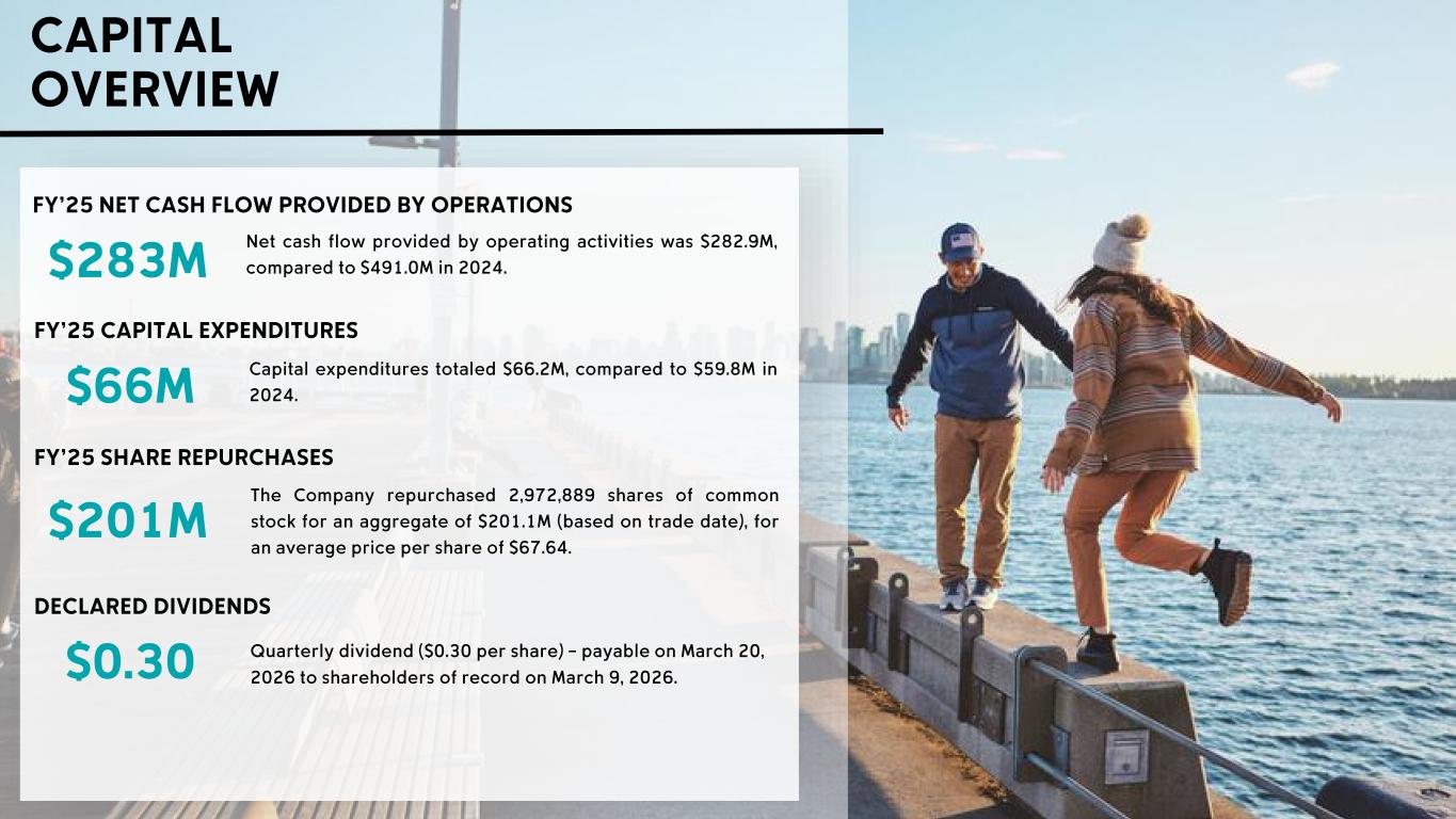 CAPITAL OVERVIEW $283M Net cash flow provided by operating activities was $282 .9M, compared to $491 .0M in 2024 . Capital expenditures totaled $66 .2M, compared to $59 .8M in 2024 . $201M The Company repurchased 2 ,972 ,889 shares of common stock for an aggregate of $201 .1M (based on trade date), for an average price per share of $67 .64 . FY’25 SHARE REPURCHASES FY’25 CAPITAL EXPENDITURES FY’25 NET CASH FLOW PROVIDED BY OPERATIONS $0.30 Quarterly dividend ($0.30 per share) – payable on March 20, 2026 to shareholders of record on March 9, 2026. DECLARED DIVIDENDS $66M