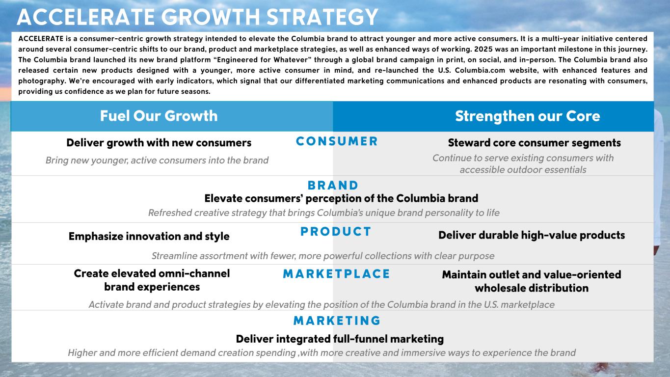 CSC Confidential – Sensitive Information ACCELERATE GROWTH STRATEGY MARKETPLACECreate elevated omni - channel brand experiences Maintain outlet and value - oriented wholesale distribution Activate brand and product strategies by elevating the position of the Columbia brand in the U.S. m arketplace PRODUCTEmphasize innovation and style Deliver durable high - value products Streamline assortment with fewer, more powerful collections with clear purpose BRAND CONSUMER Fuel Our Growth Strengthen our Core Elevate consumers’ perception of the Columbia brand Refreshed creative strategy that brings Columbia’s unique brand personality to life Deliver growth with new consumers Bring new younger, active consumers into the brand Steward core consumer segments Continue to serve existing consumers with accessible outdoor essentials MARKETING Deliver integrated full - funnel marketing Higher and more efficient demand creation spending ,with more creative and immersive ways to experience the brand ACCELERATE is a consumer - centric growth strategy intended to elevate the Columbia brand to attract younger and more active consumers . It is a multi - year initiative centered around several consumer - centric shifts to our brand, product and marketplace strategies, as well as enhanced ways of working . 2025 was an important milestone in this journey . The Columbia brand launched its new brand platform “Engineered for Whatever” through a global brand campaign in print, on social, and in - person . The Columbia brand also released certain new products designed with a younger, more active consumer in mind, and re - launched the U.S. Columbia .com website, with enhanced features and photography . We’re encouraged with early indicators, which signal that our differentiated marketing communications and enhanced products are resonating with consumers, providing us confidence as we plan for future seasons .