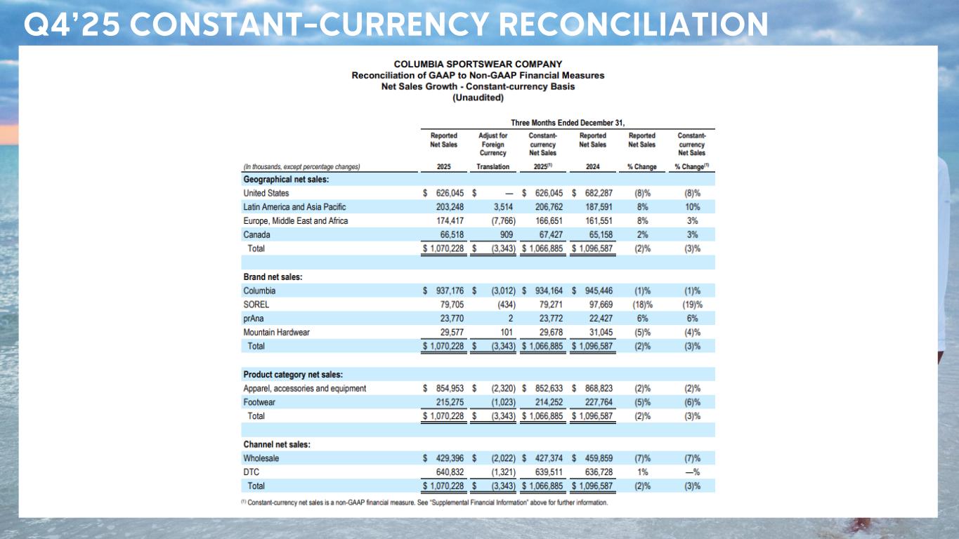 CSC Confidential – Sensitive Information Q4’25 REGIONAL NET SALES PERFORMANCE Commentary below is based on constant currency performance . U.S. • Wholesale : down high - teens %, earlier wholesale shipment timing, coupled with lower Fall ’25 orders • DTC : down LSD % (DTC B&M down LSD %, DTC .com down LSD %) • The Company had 173 stores (152 outlets, 21 branded) exiting Q 4 ’25 vs . 172 stores (154 outlets, 18 branded) exiting Q 4 ’24 • In addition, the Company operated 8 temporary clearance locations existing Q 4 ’25 vs . 28 temporary clearance locations exiting Q 4 ’24 LAAP • Japan : up MSD % (up HSD % c .c .), led by wholesale sales, reflecting later shipment of increased Fall ‘25 orders • China : up LDD % (up LDD % c .c .), outdoor category trends remain solid despite dampened demand for winter season products • Korea : down LSD % (up LSD % c .c .), aided by the execution of marketplace initiatives despite a challenged outdoor market • LAAP distributor : up high - teens % reflecting healthy orderbook growth EMEA • Europe - direct : up MSD % (up slightly c .c .), strong DTC B&M outlet performance, partially offset by lower wholesale, reflecting earlier wholesale shipment timing . Results across channels reflect dampened demand for winter season products . • EMEA distributor : up low - teens %, reflecting healthy orderbook growth Canada • up LSD % (up LSD % c .c .), led by growth in DTC, reflecting increased productivity from existing stores and new stores Q 4 ’25 NET SALES VS . Q 4 ’24 CANADA +2% (+3% c.c.) $67M U.S. - 8% (- 8% c.c.) $626M EMEA +8 % (+3% c.c.) $174M LAAP +8% (+10% c.c.) $203M