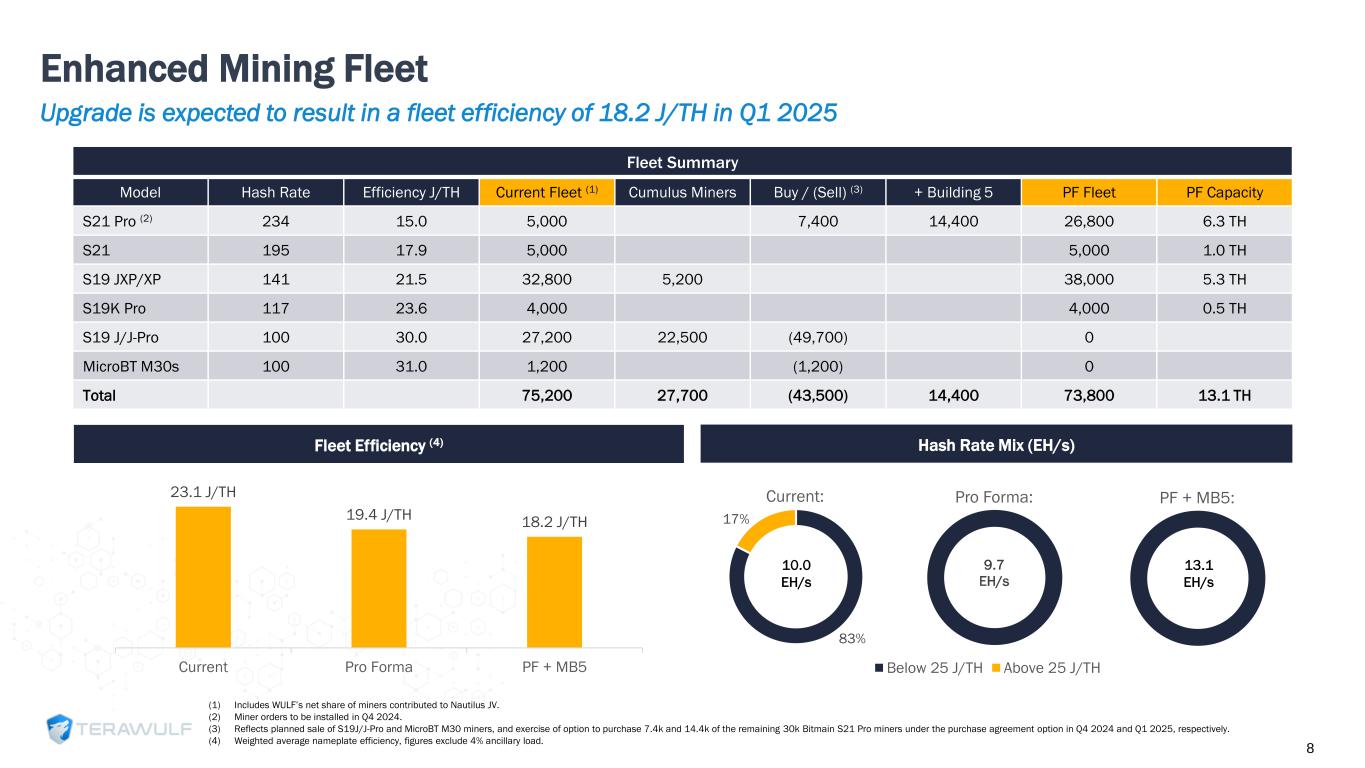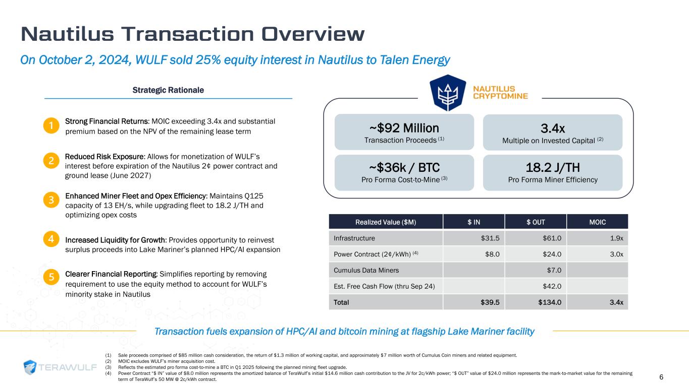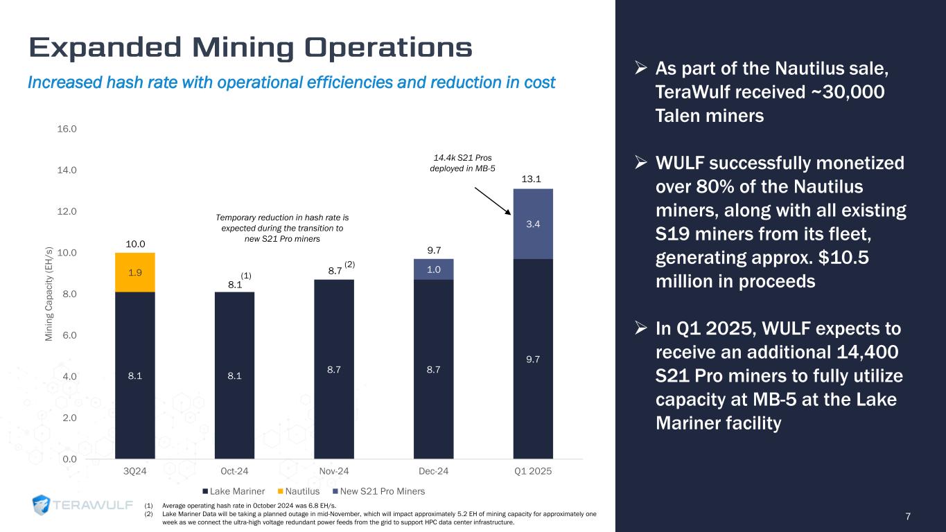 Strong Financial Returns: MOIC exceeding 3.4x and substantial premium based on the NPV of the remaining lease term Reduced Risk Exposure: Allows for monetization of WULF’s interest before expiration of the Nautilus 2¢ power contract and ground lease (June 2027) Enhanced Miner Fleet and Opex Efficiency: Maintains Q125 capacity of 13 EH/s, while upgrading fleet to 18.2 J/TH and optimizing opex costs Increased Liquidity for Growth: Provides opportunity to reinvest surplus proceeds into Lake Mariner’s planned HPC/AI expansion Clearer Financial Reporting: Simplifies reporting by removing requirement to use the equity method to account for WULF’s minority stake in Nautilus Strategic Rationale Realized Value ($M) $ IN $ OUT MOIC Infrastructure $31.5 $61.0 1.9x Power Contract (2¢/kWh) (4) $8.0 $24.0 3.0x Cumulus Data Miners $7.0 Est. Free Cash Flow (thru Sep 24) $42.0 Total $39.5 $134.0 3.4x ~$92 Million Transaction Proceeds (1) ~$36k / BTC Pro Forma Cost-to-Mine (3) 3.4x Multiple on Invested Capital (2) 18.2 J/TH Pro Forma Miner Efficiency (1) Sale proceeds comprised of $85 million cash consideration, the return of $1.3 million of working capital, and approximately $7 million worth of Cumulus Coin miners and related equipment. (2) MOIC excludes WULF’s miner acquisition cost. (3) Reflects the estimated pro forma cost-to-mine a BTC in Q1 2025 following the planned mining fleet upgrade. (4) Power Contract “$ IN” value of $8.0 million represents the amortized balance of TeraWulf’s initial $14.6 million cash contribution to the JV for 2c/kWh power; “$ OUT” value of $24.0 million represents the mark-to-market value for the remaining term of TeraWulf’s 50 MW @ 2c/kWh contract. On October 2, 2024, WULF sold 25% equity interest in Nautilus to Talen Energy Transaction fuels expansion of HPC/AI and bitcoin mining at flagship Lake Mariner facility 6