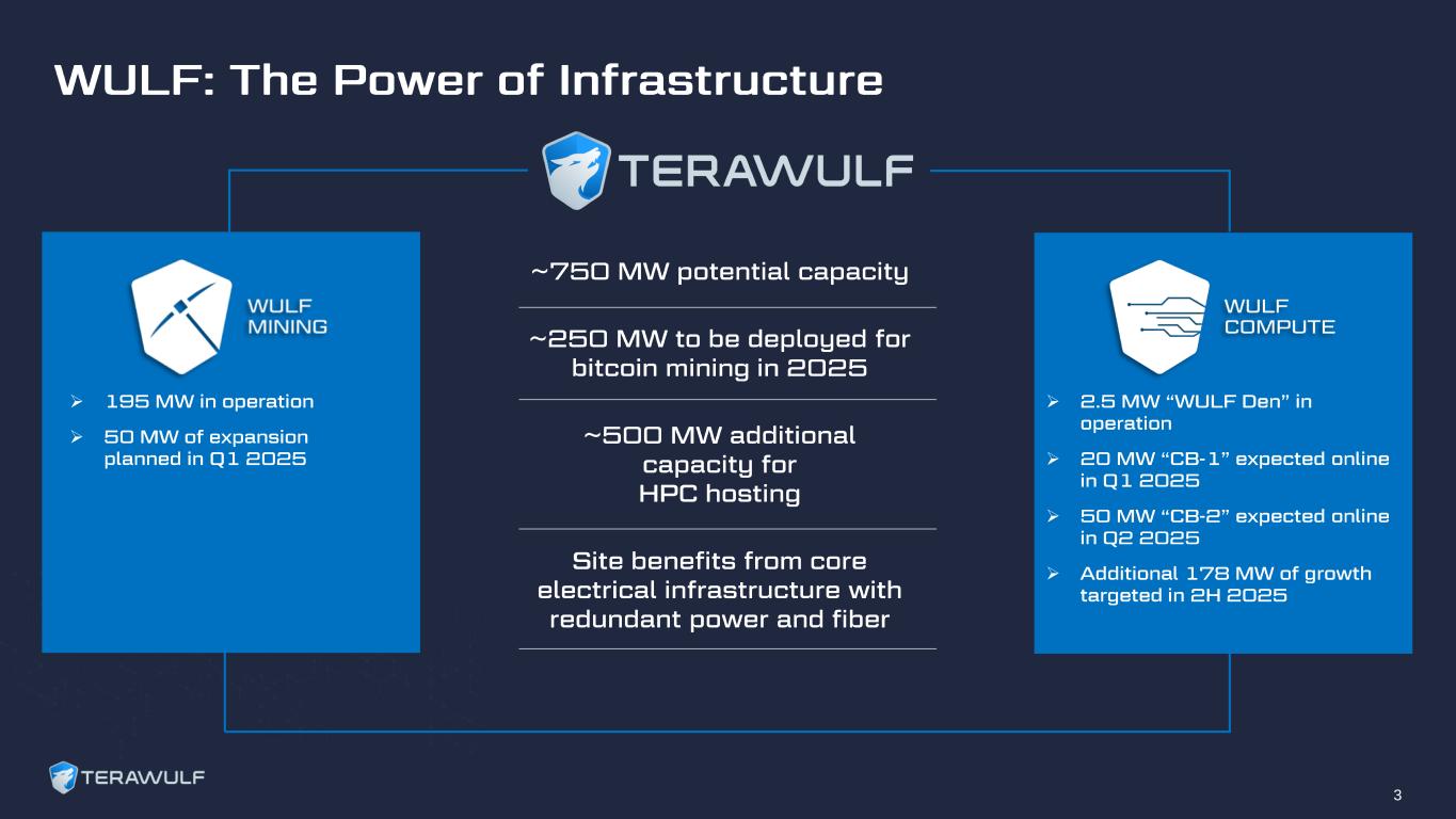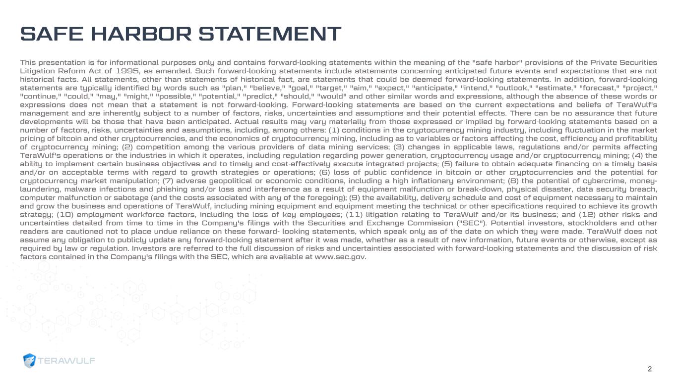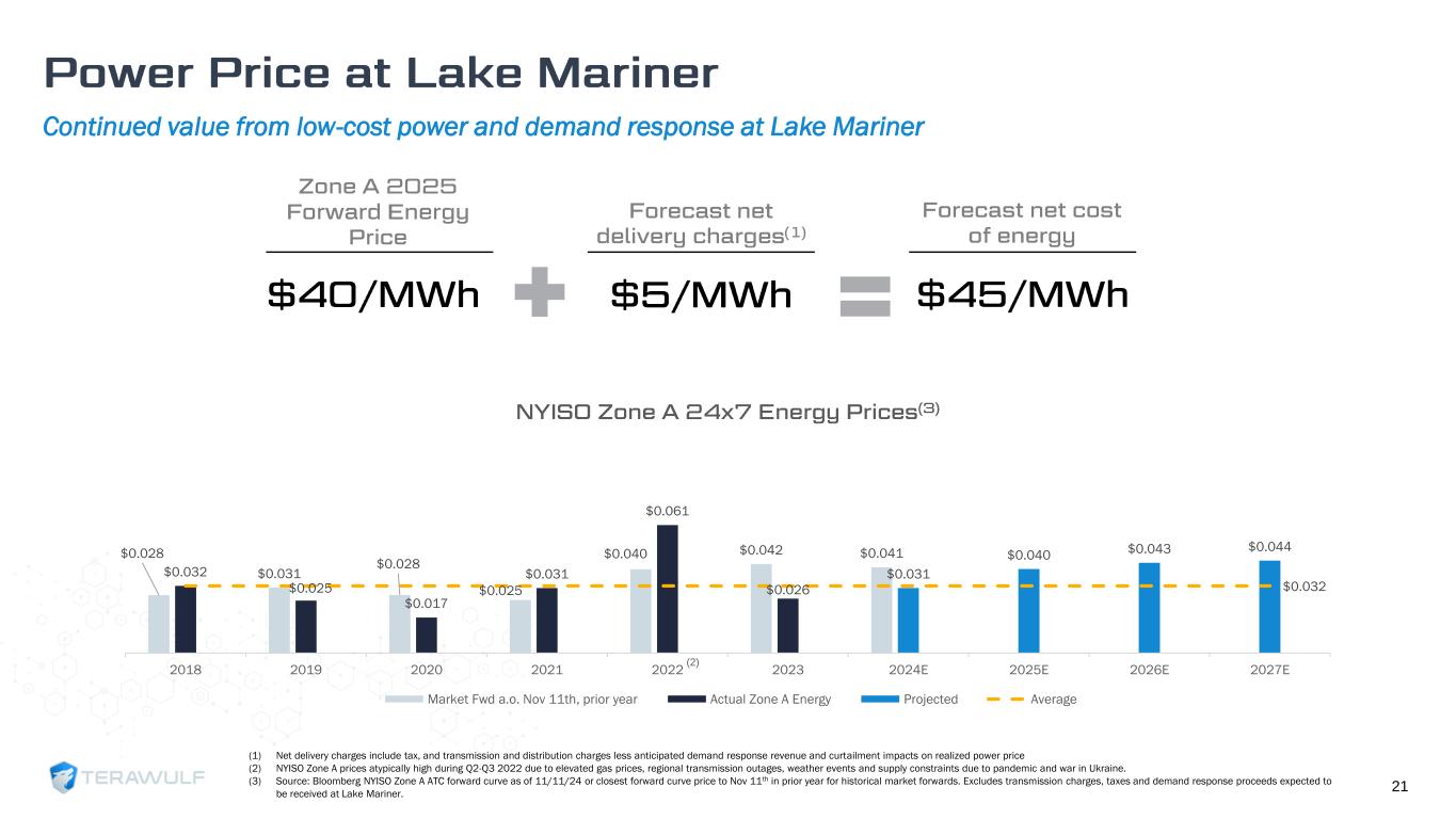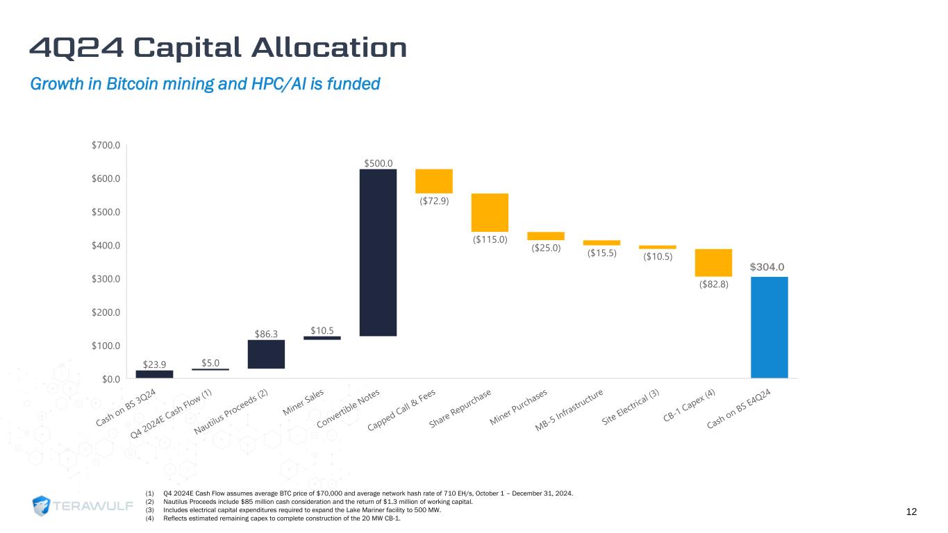 Strong Financial Returns: MOIC exceeding 3.4x and substantial premium based on the NPV of the remaining lease term Reduced Risk Exposure: Allows for monetization of WULF’s interest before expiration of the Nautilus 2¢ power contract and ground lease (June 2027) Enhanced Miner Fleet and Opex Efficiency: Maintains Q125 capacity of 13 EH/s, while upgrading fleet to 18.2 J/TH and optimizing opex costs Increased Liquidity for Growth: Provides opportunity to reinvest surplus proceeds into Lake Mariner’s planned HPC/AI expansion Clearer Financial Reporting: Simplifies reporting by removing requirement to use the equity method to account for WULF’s minority stake in Nautilus Strategic Rationale Realized Value ($M) $ IN $ OUT MOIC Infrastructure $31.5 $61.0 1.9x Power Contract (2¢/kWh) (4) $8.0 $24.0 3.0x Cumulus Data Miners $7.0 Est. Free Cash Flow (thru Sep 24) $42.0 Total $39.5 $134.0 3.4x ~$92 Million Transaction Proceeds (1) ~$36k / BTC Pro Forma Cost-to-Mine (3) 3.4x Multiple on Invested Capital (2) 18.2 J/TH Pro Forma Miner Efficiency (1) Sale proceeds comprised of $85 million cash consideration, the return of $1.3 million of working capital, and approximately $7 million worth of Cumulus Coin miners and related equipment. (2) MOIC excludes WULF’s miner acquisition cost. (3) Reflects the estimated pro forma cost-to-mine a BTC in Q1 2025 following the planned mining fleet upgrade. (4) Power Contract “$ IN” value of $8.0 million represents the amortized balance of TeraWulf’s initial $14.6 million cash contribution to the JV for 2c/kWh power; “$ OUT” value of $24.0 million represents the mark-to-market value for the remaining term of TeraWulf’s 50 MW @ 2c/kWh contract. On October 2, 2024, WULF sold 25% equity interest in Nautilus to Talen Energy Transaction fuels expansion of HPC/AI and bitcoin mining at flagship Lake Mariner facility 6