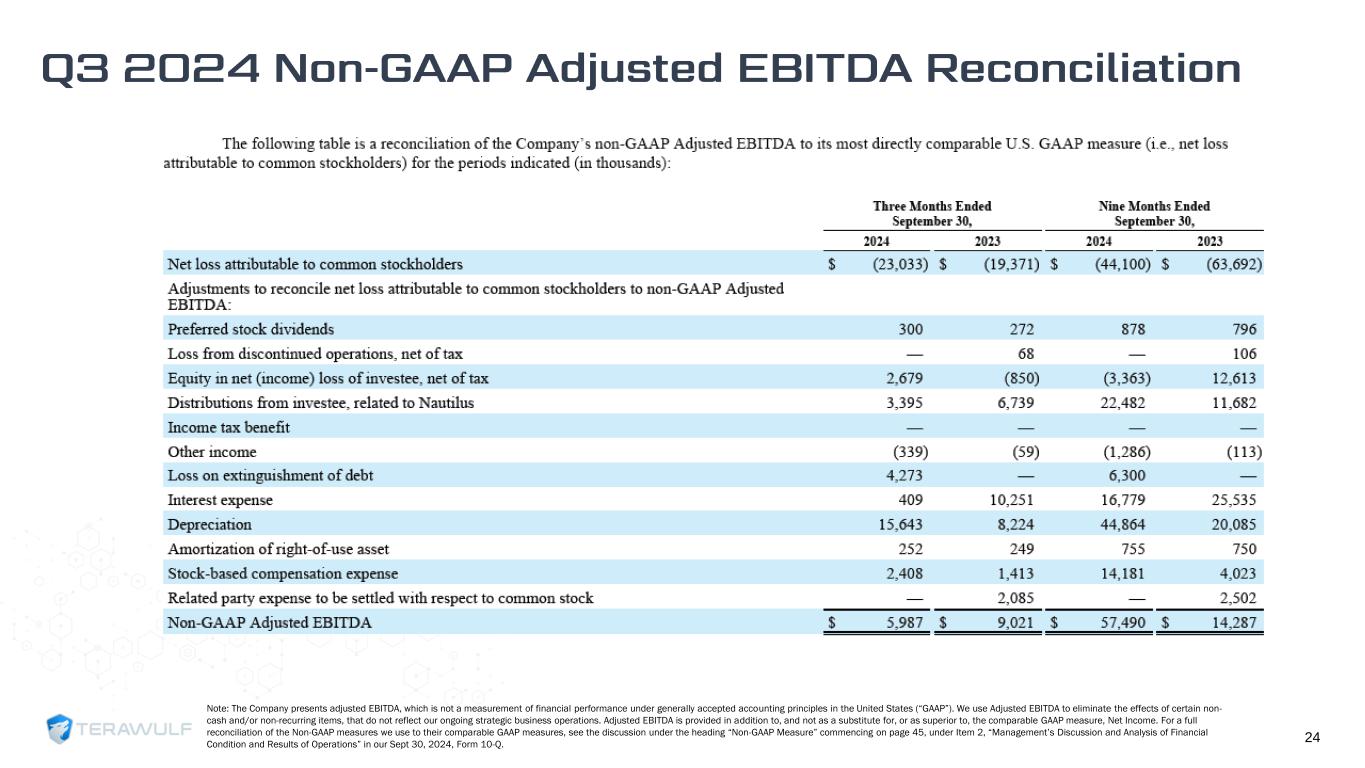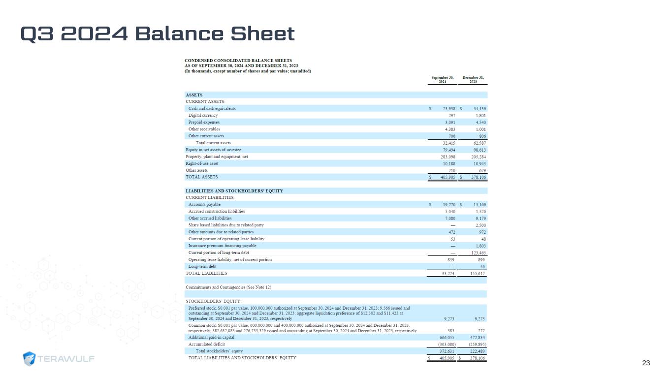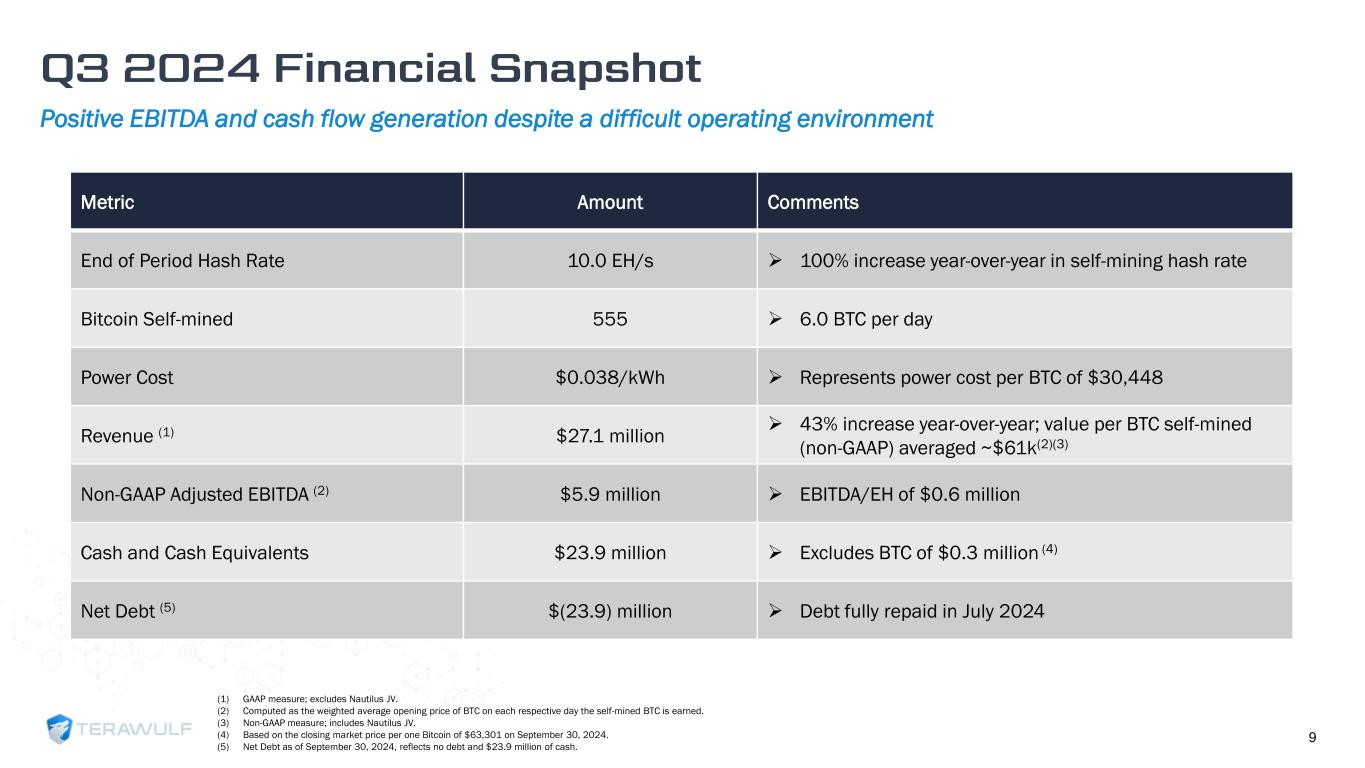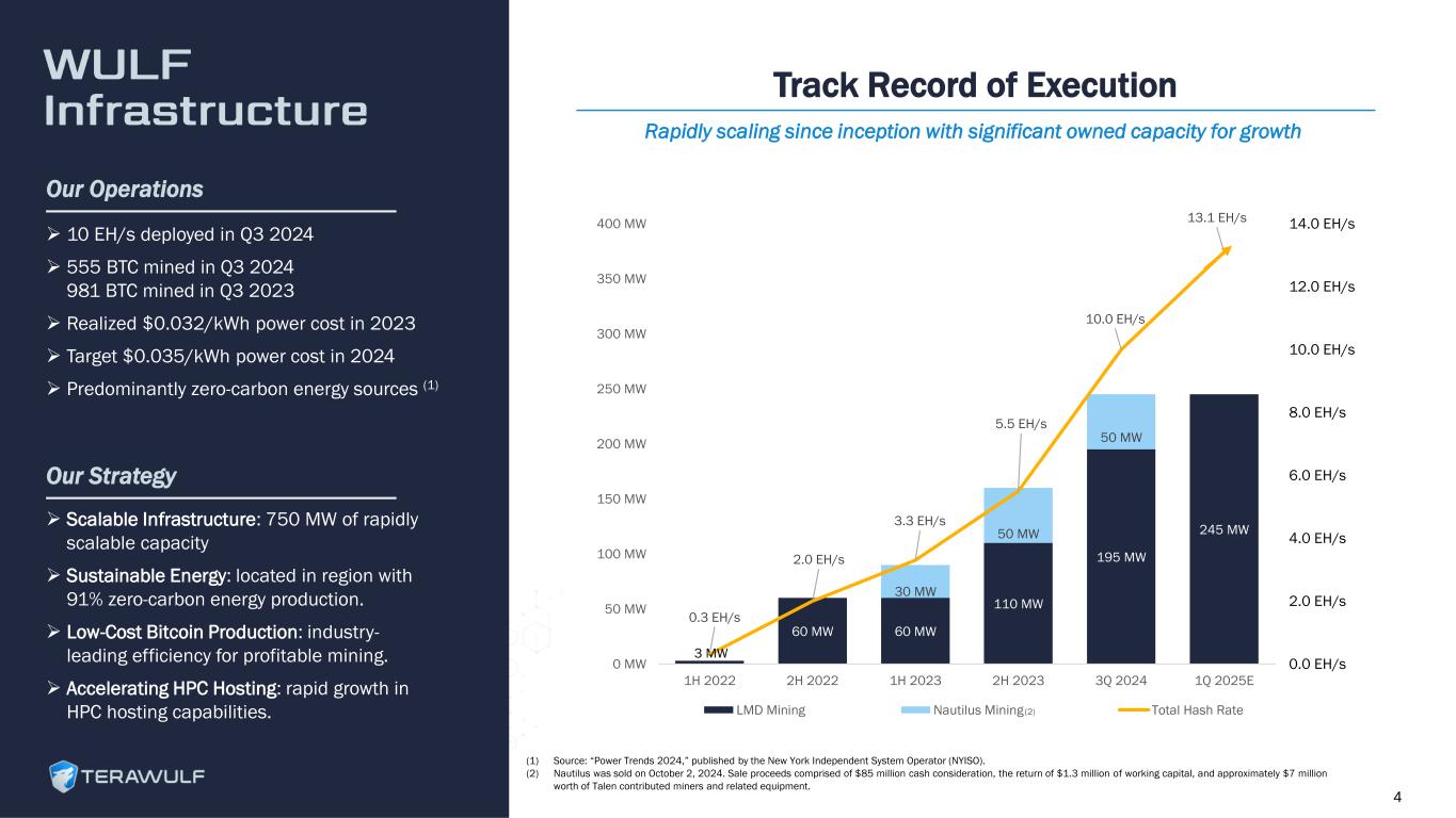 All figures include TeraWulf’s net share of Nautilus JV 10 889 980 959 1,051 699 555 Q2 2023 Q3 2023 Q4 2023 Q1 2024 Q2 2024 Q3 2024 5.5 5.5 5.5 8.0 8.8 10.0 Q2 2023 Q3 2023 Q4 2023 Q1 2024 Q2 2024 Q3 2024 $19.4 $18.7 $25.0 $40.5 $32.2 $17.0 Q2 2023 Q3 2023 Q4 2023 Q1 2024 Q2 2024 Q3 2024 $7.6 $9.0 $16.4 $32.0 $19.5 $6.0 Q2 2023 Q3 2023 Q4 2023 Q1 2024 Q2 2024 Q3 2024 (1) Excludes bitcoin earned via hosting profit share. (2) Includes gross total hosted hash rate. (3) Calculated as Revenue less Cost of Revenue (exclusive of depreciation, inclusive of demand response proceeds); includes WULF’s share of Nautilus JV. (4) Includes distributions from Nautilus JV. ➢ 555 BTC mined in Q3 2024 ➢ Operating capacity increased 82% y-o-y to 10.0 EH/s ➢ EBITDA per EH of $0.6 million