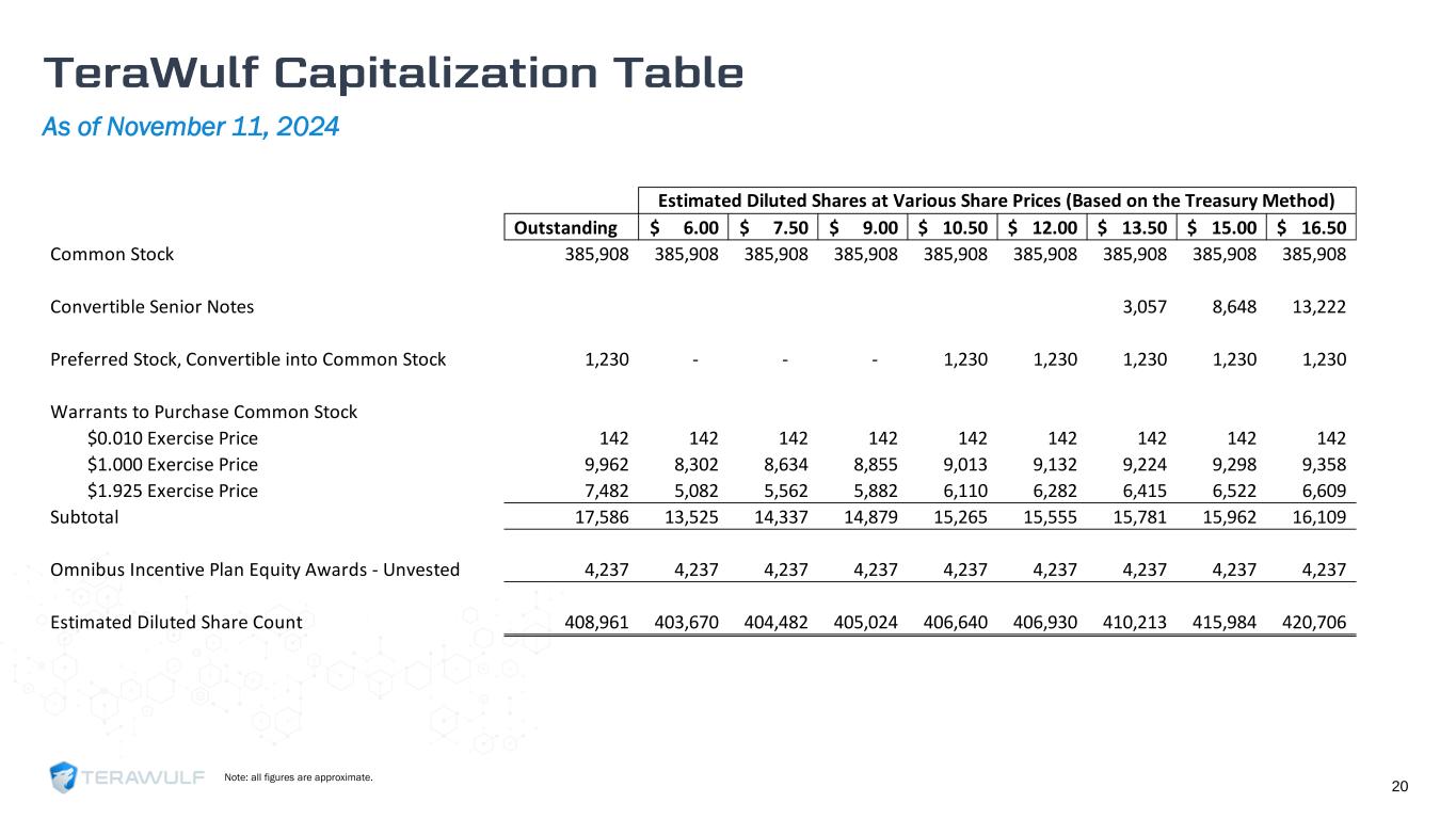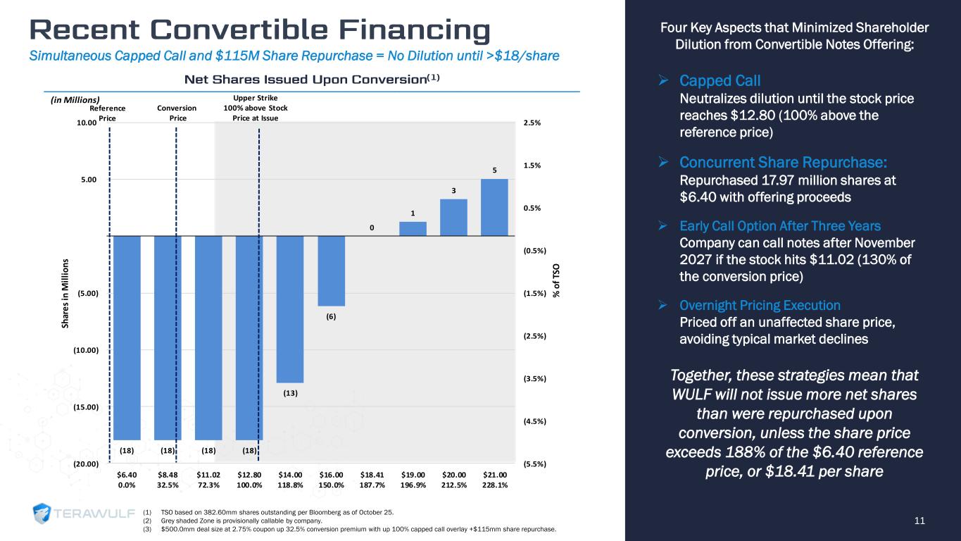 11 Net shares Issued Upon Conversion (Grey Shaded Zone is Provisionally Callable by Company) $500.0mm Deal Size at 2.75% coupon up 32.50% Conversion Premium with up 100.0% Capped Call Overlay + $115mm share repurchase (in Millions) (18) (18) (18) (18) (13) (6) 0 1 3 5 (5.5%) (4.5%) (3.5%) (2.5%) (1.5%) (0.5%) 0.5% 1.5% 2.5% (20.00) (15.00) (10.00) (5.00) 5.00 10.00 $6.40 0.0% $8.48 32.5% $11.02 72.3% $12.80 100.0% $14.00 118.8% $16.00 150.0% $18.41 187.7% $19.00 196.9% $20.00 212.5% $21.00 228.1% % o f TS O Sh ar e s in M il li o n s Conversion Price Upper Strike 100% above Stock Price at Issue Reference Price Four Key Aspects that Minimized Shareholder Dilution from Convertible Notes Offering: ➢ Capped Call Neutralizes dilution until the stock price reaches $12.80 (100% above the reference price) ➢ Concurrent Share Repurchase: Repurchased 17.97 million shares at $6.40 with offering proceeds ➢ Early Call Option After Three Years Company can call notes after November 2027 if the stock hits $11.02 (130% of the conversion price) ➢ Overnight Pricing Execution Priced off an unaffected share price, avoiding typical market declines Together, these strategies mean that WULF will not issue more net shares than were repurchased upon conversion, unless the share price exceeds 188% of the $6.40 reference price, or $18.41 per share Simultaneous Capped Call and $115M Share Repurchase = No Dilution until >$18/share (1) TSO based on 382.60mm shares outstanding per Bloomberg as of October 25. (2) Grey shaded Zone is provisionally callable by company. (3) $500.0mm deal size at 2.75% coupon up 32.5% conversion premium with up 100% capped call overlay +$115mm share repurchase.