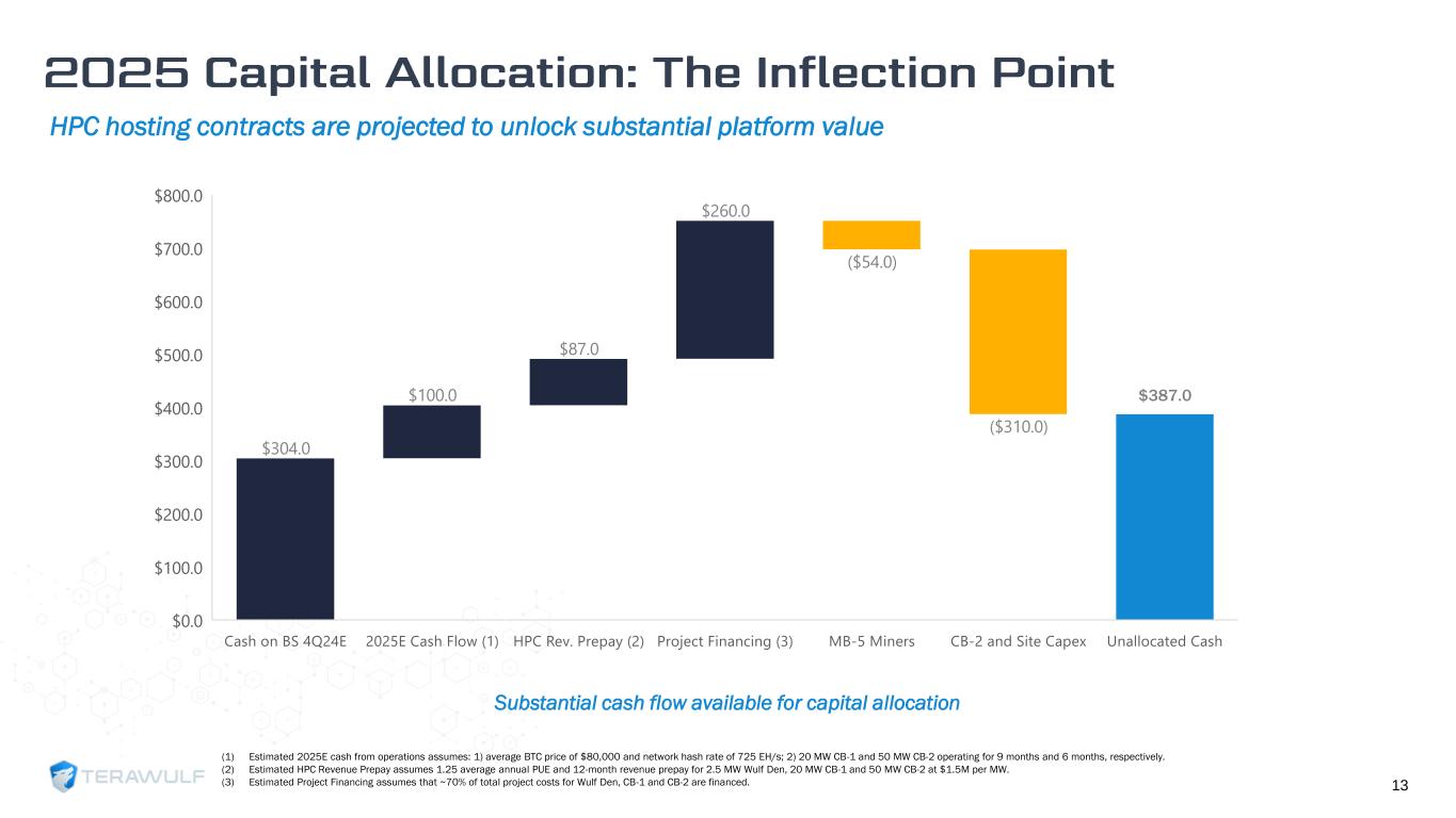 Growth in Bitcoin mining and HPC/AI is funded 12 (1) Q4 2024E Cash Flow assumes average BTC price of $70,000 and average network hash rate of 710 EH/s, October 1 – December 31, 2024. (2) Nautilus Proceeds include $85 million cash consideration and the return of $1.3 million of working capital. (3) Includes electrical capital expenditures required to expand the Lake Mariner facility to 500 MW. (4) Reflects estimated remaining capex to complete construction of the 20 MW CB-1. $304.0