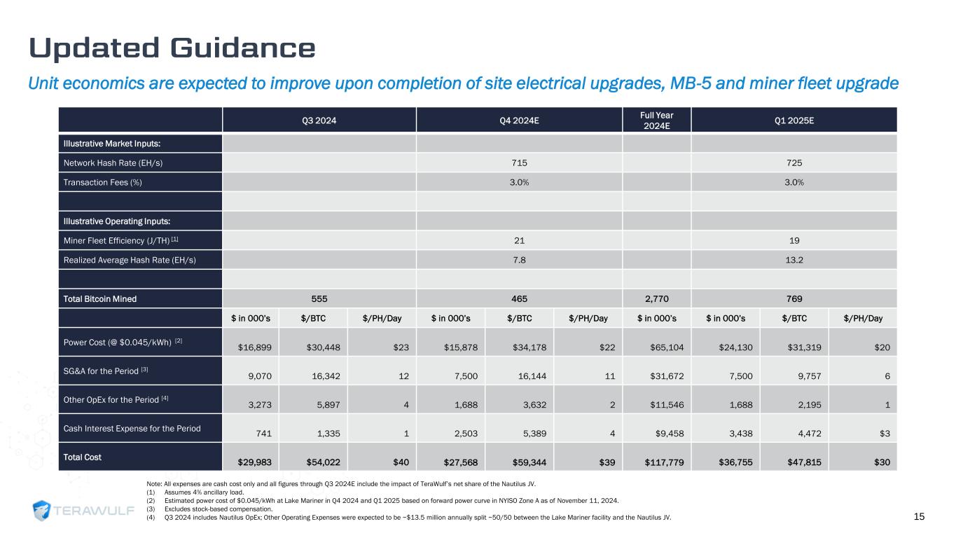 Unit economics are expected to improve upon completion of site electrical upgrades, MB-5 and miner fleet upgrade 15 Q3 2024 Q4 2024E Full Year 2024E Q1 2025E Illustrative Market Inputs: Network Hash Rate (EH/s) 715 725 Transaction Fees (%) 3.0% 3.0% Illustrative Operating Inputs: Miner Fleet Efficiency (J/TH) [1] 21 19 Realized Average Hash Rate (EH/s) 7.8 13.2 Total Bitcoin Mined 555 465 2,770 769 $ in 000’s $/BTC $/PH/Day $ in 000’s $/BTC $/PH/Day $ in 000’s $ in 000’s $/BTC $/PH/Day Power Cost (@ $0.045/kWh) [2] $16,899 $30,448 $23 $15,878 $34,178 $22 $65,104 $24,130 $31,319 $20 SG&A for the Period [3] 9,070 16,342 12 7,500 16,144 11 $31,672 7,500 9,757 6 Other OpEx for the Period [4] 3,273 5,897 4 1,688 3,632 2 $11,546 1,688 2,195 1 Cash Interest Expense for the Period 741 1,335 1 2,503 5,389 4 $9,458 3,438 4,472 $3 Total Cost $29,983 $54,022 $40 $27,568 $59,344 $39 $117,779 $36,755 $47,815 $30 Note: All expenses are cash cost only and all figures through Q3 2024E include the impact of TeraWulf’s net share of the Nautilus JV. (1) Assumes 4% ancillary load. (2) Estimated power cost of $0.045/kWh at Lake Mariner in Q4 2024 and Q1 2025 based on forward power curve in NYISO Zone A as of November 11, 2024. (3) Excludes stock-based compensation. (4) Q3 2024 includes Nautilus OpEx; Other Operating Expenses were expected to be ~$13.5 million annually split ~50/50 between the Lake Mariner facility and the Nautilus JV.
