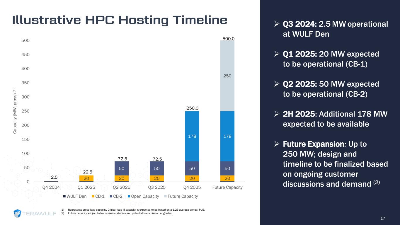 Maximizing land, megawatts, and capital for optimal long-term value creation 16 Cloud Service Provider (CSP) Colocation – Whitespace & Rack Ready Build to Suit Description Shell data center and GPU clusters; space, power, cooling, fiber/internet, security, compute, storage and environment. Shell data center; lease rack ready whitespace including redundant power, cooling, fiber/internet, and security Data center built to spec; lease space, redundant power, cooling, fiber/internet, and security Customer Multiple – Managed through cloud partner Multiple – Enterprise and well funded startups Single – Hyperscaler Contract Size 0.1 – 50 MW 0.5 – 100 MW+ 100+ MW Contract Term 1 – 36 months 5 – 15 years 15+ years with renewals O&M WULF managed WULF managed Tenant managed Build Cost per MW $27 – 30 million (1) $6 – 8 million (1) $2 – 4 million (4) Financing Equity & Debt Equity (initially) Highly Bankable Revenue per MW $11 – 18 million (2) $1.3 – 1.8 million (3) $0.2 – 0.5 million Margins 70 – 80% 65 – 75% 90% + Valuation Range 7-12x EBITDA 10-15x EBITDA 15-20x EBITDA (1) Build cost for CSP and colocation model reflect liquid cooling infrastructure. (2) Low end of range based on long-term reserve contract at $2.1/GPU/hr with 100% rental utilization, high end of range represents $4.50/GPU/hr of on- demand revenue at 80% rental utilization. (3) Does not include customer pass-through energy expense. Subject to term length and payment terms. (4) Based on air cooled powered shell infrastructure. NNN Rent Structure; customer pays all OpEx directly. WULF Compute’s Core Business
