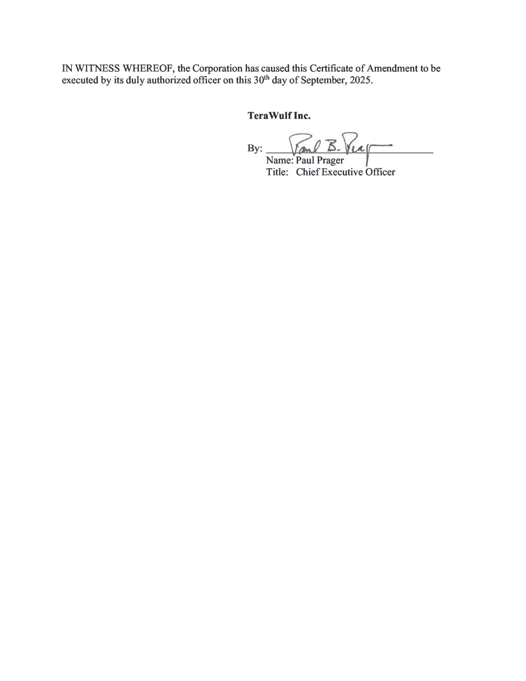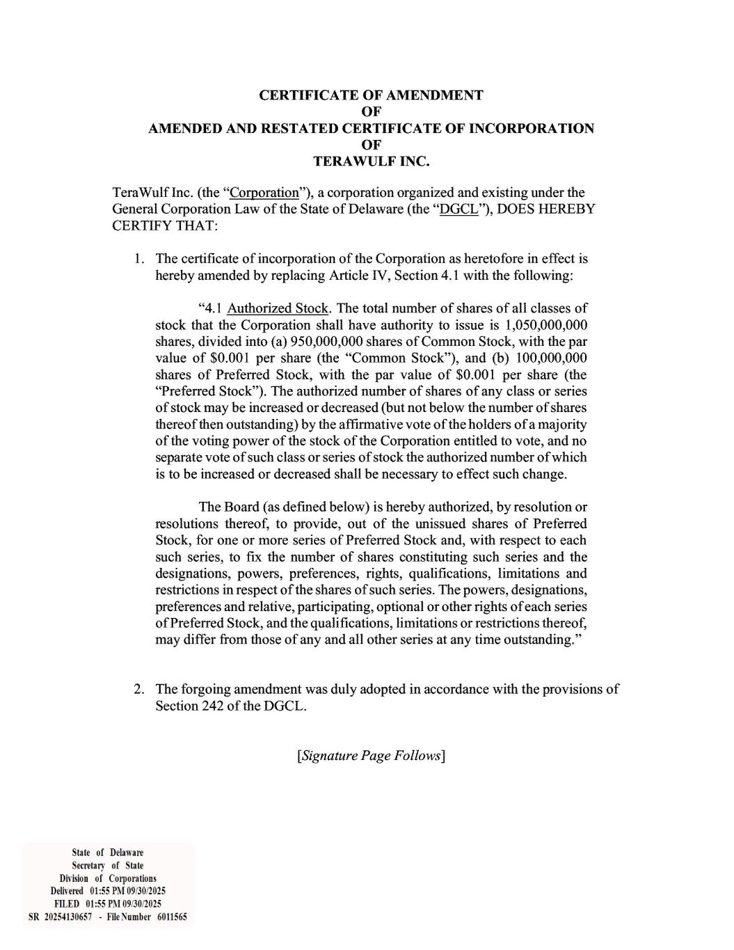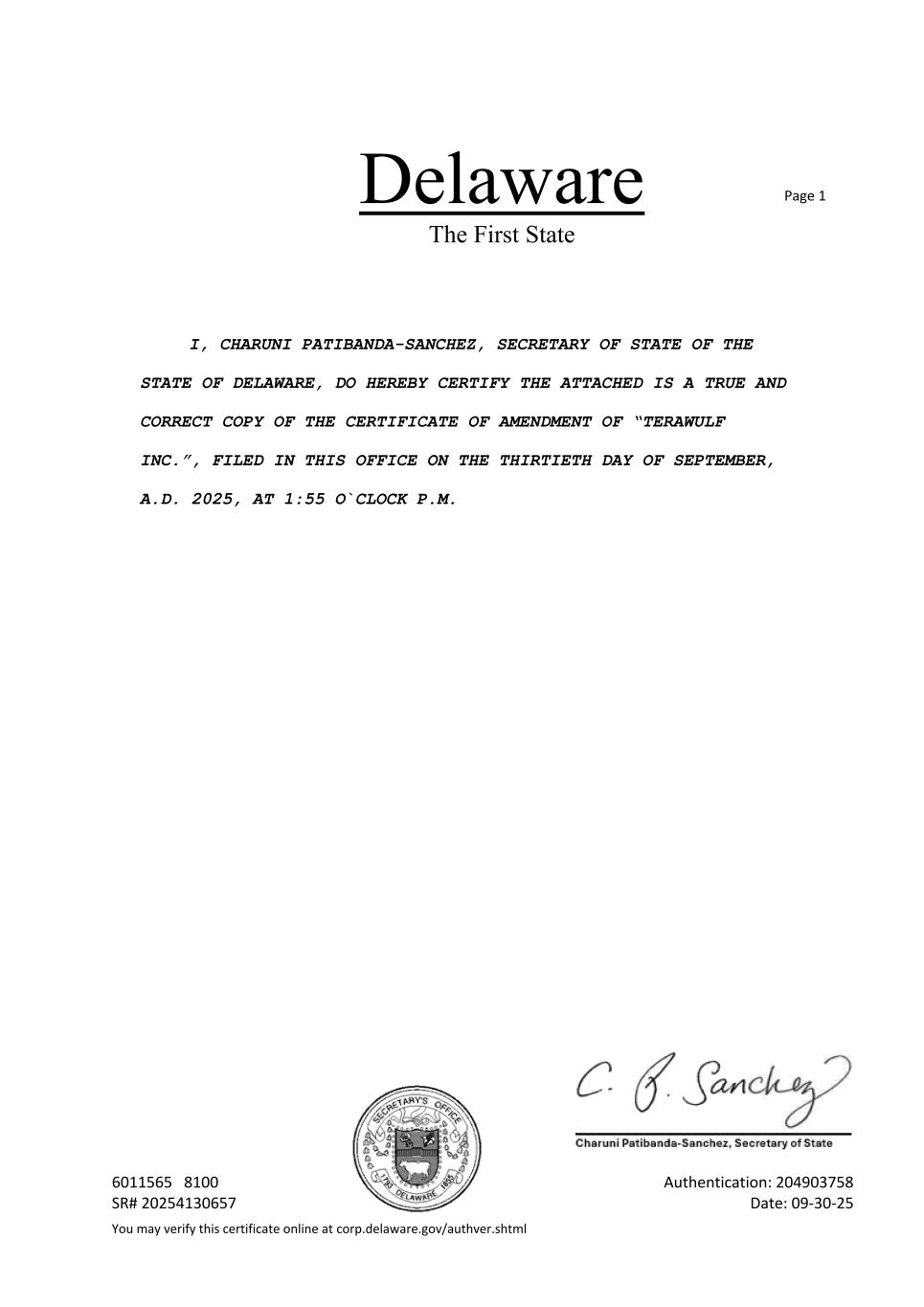 Delaware The First State Page 1 6011565 8100 Authentication: 204903758 SR# 20254130657 Date: 09-30-25 You may verify this certificate online at corp.delaware.gov/authver.shtml I, CHARUNI PATIBANDA-SANCHEZ, SECRETARY OF STATE OF THE STATE OF DELAWARE, DO HEREBY CERTIFY THE ATTACHED IS A TRUE AND CORRECT COPY OF THE CERTIFICATE OF AMENDMENT OF “TERAWULF INC.”, FILED IN THIS OFFICE ON THE THIRTIETH DAY OF SEPTEMBER, A.D. 2025, AT 1:55 O`CLOCK P.M.