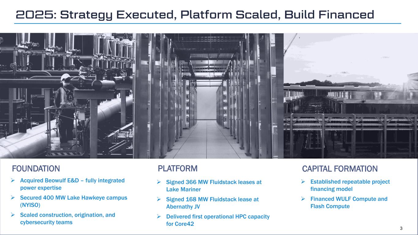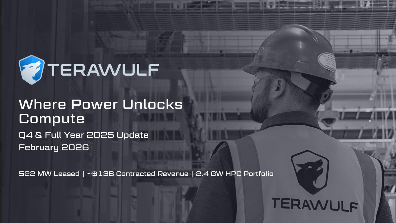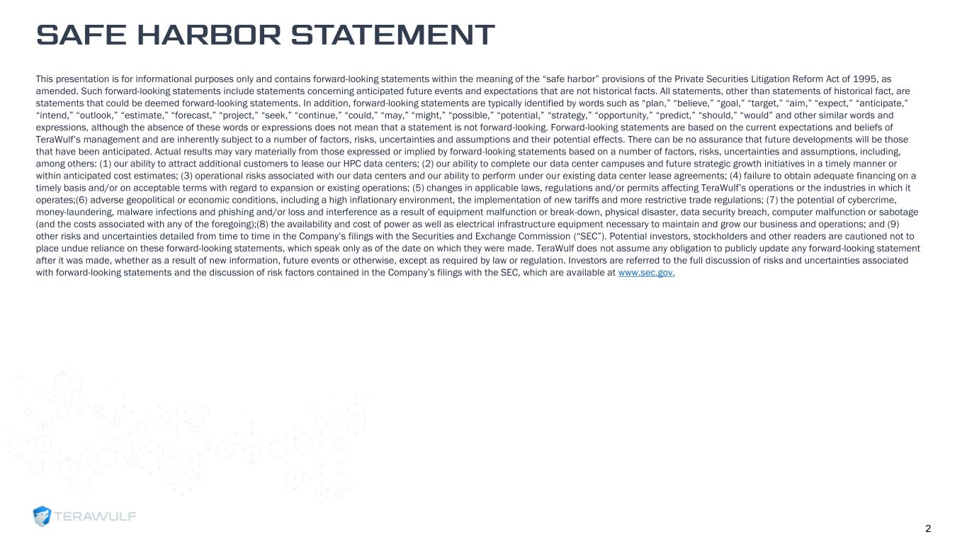 Geom Slide Title – 28 Franklin Gothic Med Header – 14 Franklin Gothic Book Content Text – 14 Franklin Gothic Book Chart Content – 10 RGB 33 – 40 – 64 20 – 135 – 211 129 – 200 – 255 205 – 217 – 225 74 – 88 – 135 Outline: black, ½ pt. 255 – 177 – 0 2 This presentation is for informational purposes only and contains forward-looking statements within the meaning of the “safe harbor” provisions of the Private Securities Litigation Reform Act of 1995, as amended. Such forward-looking statements include statements concerning anticipated future events and expectations that are not historical facts. All statements, other than statements of historical fact, are statements that could be deemed forward-looking statements. In addition, forward-looking statements are typically identified by words such as “plan,” “believe,” “goal,” “target,” “aim,” “expect,” “anticipate,” “intend,” “outlook,” “estimate,” “forecast,” “project,” “seek,” “continue,” “could,” “may,” “might,” “possible,” “potential,” “strategy,” “opportunity,” “predict,” “should,” “would” and other similar words and expressions, although the absence of these words or expressions does not mean that a statement is not forward-looking. Forward-looking statements are based on the current expectations and beliefs of TeraWulf’s management and are inherently subject to a number of factors, risks, uncertainties and assumptions and their potential effects. There can be no assurance that future developments will be those that have been anticipated. Actual results may vary materially from those expressed or implied by forward-looking statements based on a number of factors, risks, uncertainties and assumptions, including, among others: (1) our ability to attract additional customers to lease our HPC data centers; (2) our ability to complete our data center campuses and future strategic growth initiatives in a timely manner or within anticipated cost estimates; (3) operational risks associated with our data centers and our ability to perform under our existing data center lease agreements; (4) failure to obtain adequate financing on a timely basis and/or on acceptable terms with regard to expansion or existing operations; (5) changes in applicable laws, regulations and/or permits affecting TeraWulf’s operations or the industries in which it operates;(6) adverse geopolitical or economic conditions, including a high inflationary environment, the implementation of new tariffs and more restrictive trade regulations; (7) the potential of cybercrime, money-laundering, malware infections and phishing and/or loss and interference as a result of equipment malfunction or break-down, physical disaster, data security breach, computer malfunction or sabotage (and the costs associated with any of the foregoing);(8) the availability and cost of power as well as electrical infrastructure equipment necessary to maintain and grow our business and operations; and (9) other risks and uncertainties detailed from time to time in the Company’s filings with the Securities and Exchange Commission (“SEC”). Potential investors, stockholders and other readers are cautioned not to place undue reliance on these forward-looking statements, which speak only as of the date on which they were made. TeraWulf does not assume any obligation to publicly update any forward-looking statement after it was made, whether as a result of new information, future events or otherwise, except as required by law or regulation. Investors are referred to the full discussion of risks and uncertainties associated with forward-looking statements and the discussion of risk factors contained in the Company’s filings with the SEC, which are available at www.sec.gov. SAFE HARBOR STATEMENT
