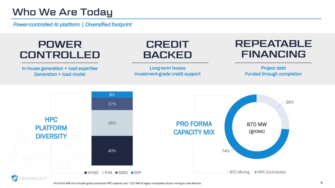 Geom Slide Title – 28 Franklin Gothic Med Header – 14 Franklin Gothic Book Content Text – 14 Franklin Gothic Book Chart Content – 10 RGB 33 – 40 – 64 20 – 135 – 211 129 – 200 – 255 205 – 217 – 225 74 – 88 – 135 Outline: black, ½ pt. 255 – 177 – 0 $1,479 (100) (225) $1,154 $268 $1,087 $1,300 ➢ Acquired Beowulf E&D – fully integrated power expertise ➢ Secured 400 MW Lake Hawkeye campus (NYISO) ➢ Scaled construction, origination, and cybersecurity teams FOUNDATION ➢ Established repeatable project financing model ➢ Financed WULF Compute and Flash Compute CAPITAL FORMATION ➢ Signed 366 MW Fluidstack leases at Lake Mariner ➢ Signed 168 MW Fluidstack lease at Abernathy JV ➢ Delivered first operational HPC capacity for Core42 PLATFORM 2025: Strategy Executed, Platform Scaled, Build Financed 3