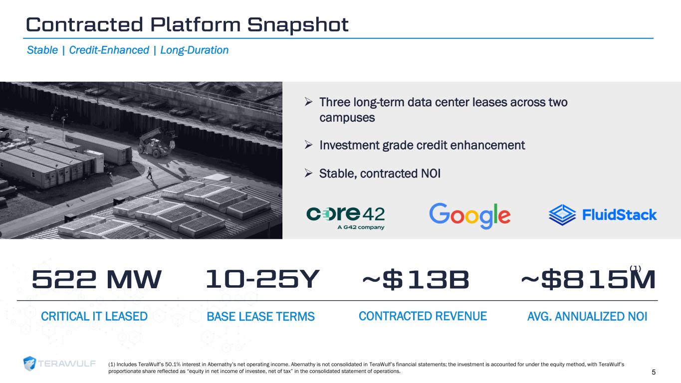 Geom Slide Title – 28 Franklin Gothic Med Header – 14 Franklin Gothic Book Content Text – 14 Franklin Gothic Book Chart Content – 10 RGB 33 – 40 – 64 20 – 135 – 211 129 – 200 – 255 205 – 217 – 225 74 – 88 – 135 Outline: black, ½ pt. 255 – 177 – 0 Who We Are Today Power-controlled AI platform | Diversified footprint 26% 74% BTC Mining HPC Contracted 870 MW (gross) POWER CONTROLLED In-house generation + load expertise Generation + load model CREDIT BACKED Long-term leases Investment-grade credit support REPEATABLE FINANCING Project debt Funded through completion 40% 35% 17% 8% NYISO PJM MISO SPP PRO FORMA CAPACITY MIX HPC PLATFORM DIVERSITY 4Pro forma MW mix includes gross contracted HPC capacity and ~212 MW of legacy nameplate bitcoin mining at Lake Mariner.