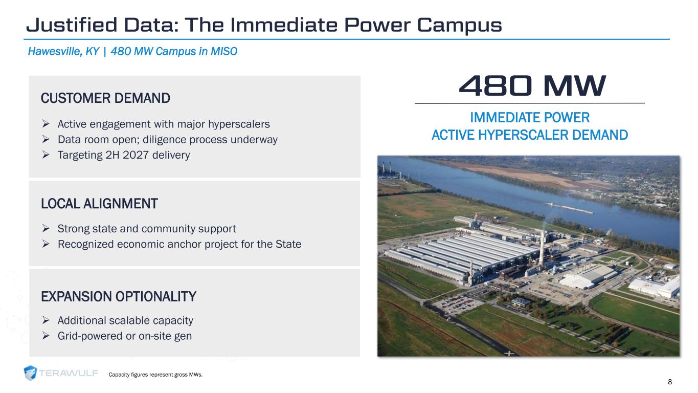 Geom Slide Title – 28 Franklin Gothic Med Header – 14 Franklin Gothic Book Content Text – 14 Franklin Gothic Book Chart Content – 10 RGB 33 – 40 – 64 20 – 135 – 211 129 – 200 – 255 205 – 217 – 225 74 – 88 – 135 Outline: black, ½ pt. 255 – 177 – 0 Serial HPC Delivery Model Standardized | Repeatable | De-Risked ➢ WULF Den (2 MW) ➢ CB-1 (16 MW) ➢ CB-2A (21 MW) (1) DELIVERED TO DATE 2026 CONSTRUCTION 2027+ PIPELINE ➢ CB-2B (21 MW, Q1) ➢ CB-3 (42 MW, May) ➢ CB-4 (168 MW, Q3) ➢ CB-5 (168 MW, Q4) ➢ Abernathy JV (84 MW) ➢ Lake Mariner (182 MW) ➢ Lake Hawkeye (320 MW) ➢ Justified Data (384 MW) ➢ Chesapeake Data (800 MW) ➢ Abernathy JV Options (168 MW) 7 Capacity figures represent critical IT MWs. (1) CB-2A: 13 MW delivered in January 2026; 8 MW delivered in February 2026