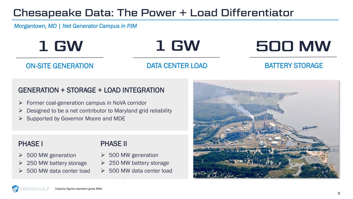 Geom Slide Title – 28 Franklin Gothic Med Header – 14 Franklin Gothic Book Content Text – 14 Franklin Gothic Book Chart Content – 10 RGB 33 – 40 – 64 20 – 135 – 211 129 – 200 – 255 205 – 217 – 225 74 – 88 – 135 Outline: black, ½ pt. 255 – 177 – 0 ➢ 500 MW generation ➢ 250 MW battery storage ➢ 500 MW data center load 9 PHASE I ➢ Former coal-generation campus in NoVA corridor ➢ Designed to be a net contributor to Maryland grid reliability ➢ Supported by Governor Moore and MDE GENERATION + STORAGE + LOAD INTEGRATION Chesapeake Data: The Power + Load Differentiator Morgantown, MD | Net Generator Campus in PJM 1 GW ON-SITE GENERATION 1 GW DATA CENTER LOAD 500 MW BATTERY STORAGE ➢ 500 MW generation ➢ 250 MW battery storage ➢ 500 MW data center load PHASE II Capacity figures represent gross MWs.
