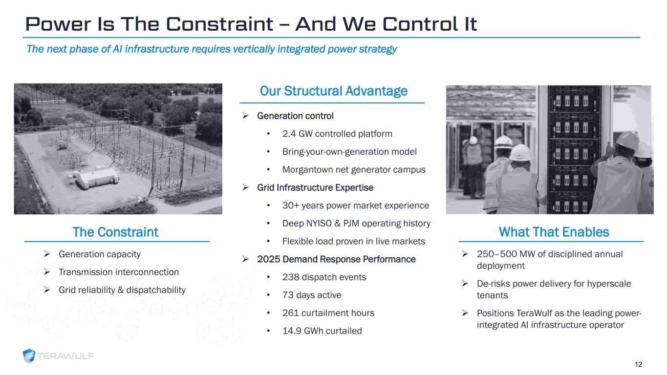 Geom Slide Title – 28 Franklin Gothic Med Header – 14 Franklin Gothic Book Content Text – 14 Franklin Gothic Book Chart Content – 10 RGB 33 – 40 – 64 20 – 135 – 211 129 – 200 – 255 205 – 217 – 225 74 – 88 – 135 Outline: black, ½ pt. 255 – 177 – 0 The Constraint Our Structural Advantage ➢ Generation control • 2.4 GW controlled platform • Bring-your-own-generation model • Morgantown net generator campus ➢ Grid Infrastructure Expertise • 30+ years power market experience • Deep NYISO & PJM operating history • Flexible load proven in live markets ➢ 2025 Demand Response Performance • 238 dispatch events • 73 days active • 261 curtailment hours • 14.9 GWh curtailed ➢ Generation capacity ➢ Transmission interconnection ➢ Grid reliability & dispatchability Power Is The Constraint – And We Control It The next phase of AI infrastructure requires vertically integrated power strategy ➢ 250–500 MW of disciplined annual deployment ➢ De-risks power delivery for hyperscale tenants ➢ Positions TeraWulf as the leading power- integrated AI infrastructure operator What That Enables 12