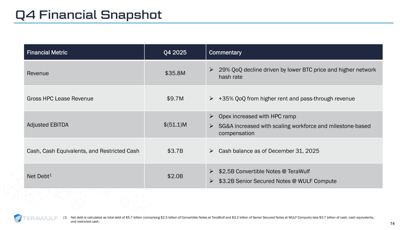 Geom Slide Title – 28 Franklin Gothic Med Header – 14 Franklin Gothic Book Content Text – 14 Franklin Gothic Book Chart Content – 10 RGB 33 – 40 – 64 20 – 135 – 211 129 – 200 – 255 205 – 217 – 225 74 – 88 – 135 Outline: black, ½ pt. 255 – 177 – 0 Capital Structure Funded through substantial completion ($ in millions) As of January 31, 2026 (1) Includes contingency (2) Reflects payments to EPC contractor, Hypertec. 50.1% Ownership Cash Justified Data Purchase Price Adjusted Cash Convertible Notes $500 (200) $300 $2,525 Cash DSRA + IDC Adjusted Cash Capex Spend Through Capex Spend Remaining (1) Senior Secured Notes WULF Compute (NY / NYISO) $3,023 (452) $2,571 $850 $2,377 $3,200 $1,479 (100) (225) $1,154 $268 $1,087 $1,300 Cash HoldCo LockBox DSRA + IDC + LOC Adjusted Cash Capex Spend Through Capex Spend Remaining (2) Senior Secured Notes Flash Compute (Texas / SPP) $1,479 (100) (225) $1,154 $268 $1,087 $1,300 $1,479 (100) (225) TBD $268 $1,087 $1,300 Justified Data (KY / MISO) $1,479 (100) (225 TBD $268 $1,087 $1,300 Chesapeake Data (MD / PJM) $1,479 (100) (225) TBD $268 $1,087 $1,300 Lake Hawkeye (NY / NYISO) 13 FUNDED PLATFORMS DEVELOPMENT PLATFORMS